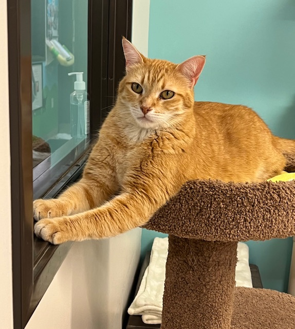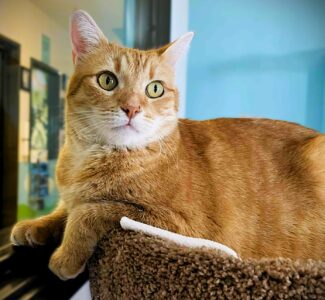 Hi, I’m Bono. I survived on the streets for several months until someone rescued me and brought me to SBACC. I’m sure I had a home once because I’m very friendly and good with people, even dogs.  I love attention, will rub on your legs, and enjoy being held, cuddled, and napping in laps.  I’m talkative, too.  I was adopted and had a home for about two months with an older single Dad.  He loved me very much, but I just wanted to play, play, play all the time, so he thought I would be much happier in a home with someone who would give me lots of playtime.