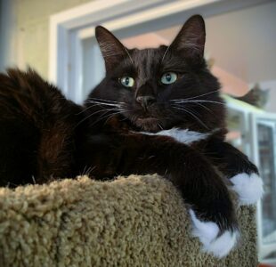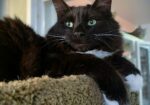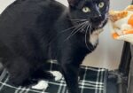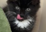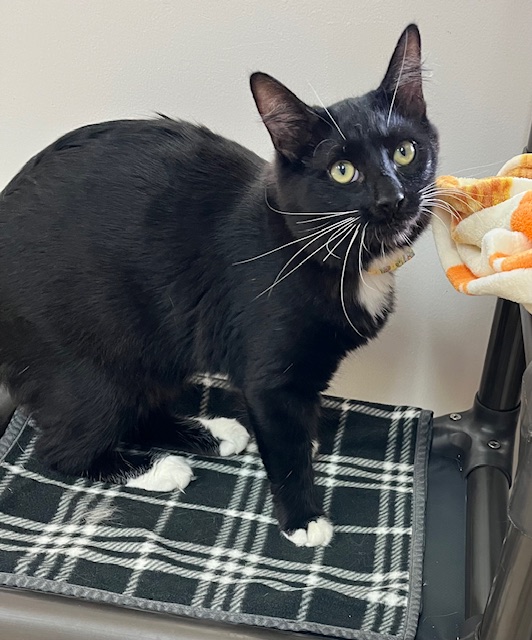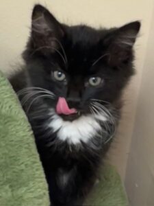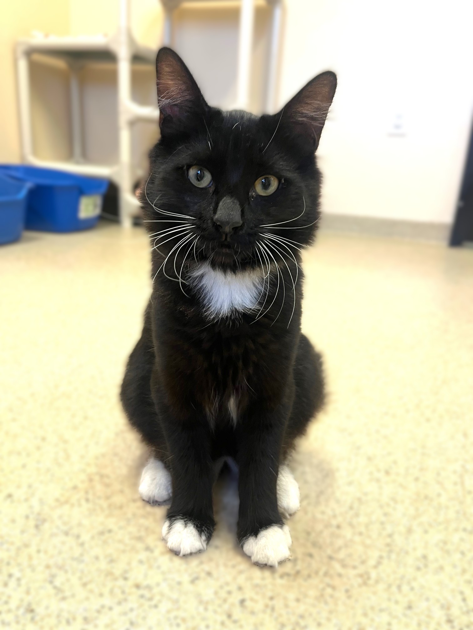 Hi, I’m Daffodil. My four sibs and I were running around in traffic when we were rescued.  We were eight weeks old, dirty, full of fleas, and very scared.   We’ve come a long way since we arrived at SBACC.  Two of our sibs have found their home, but my sister, Dahlia, and I are still waiting for ours. We’re both still a little shy and feel more secure together, but we’d probably do fine on our own if we got lots of love and attention.  Another cat or kitten in our forever home would be fine, too.