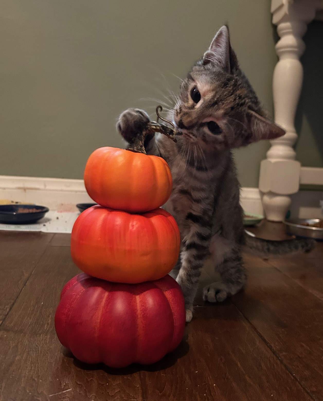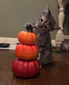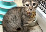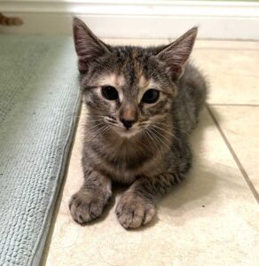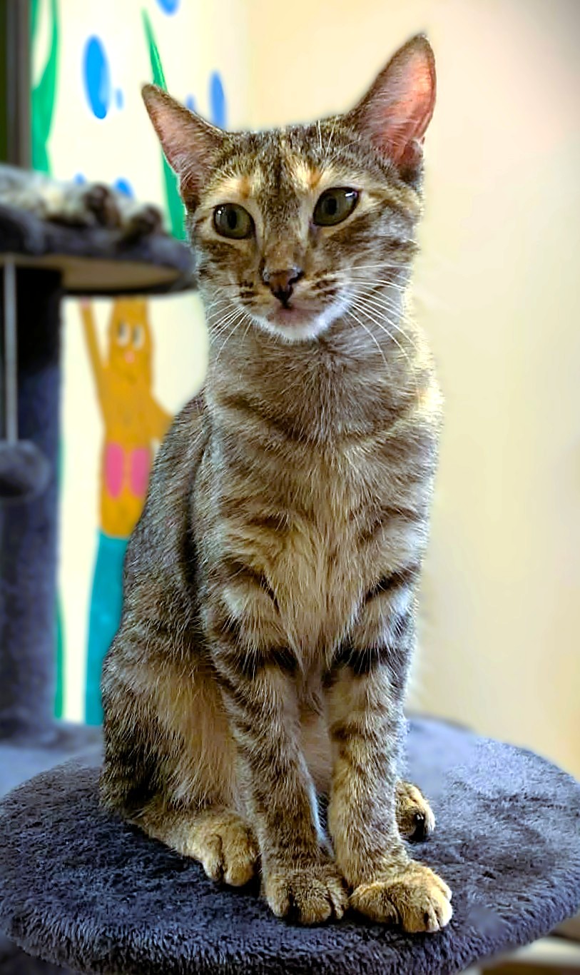 Hi, I’m Giselle. My five littermates and I came to SBACC when we were four weeks old and then went to a foster home.  I’m a torbie, which is like a tabby with orange highlights. I’m a talker, and I loved making noises when my foster mom walked into the room. I love to eat, and I’m always the first at the wet food dishes. I’m energetic and love climbing cat trees and playing with anything that moves.  I’m a friendly kitty and would love a home with another young cat or kitten. Alll my siblings have found their homes, so now it’s my turn.  Come and meet me, and you might just fall in love with me and want to take me home with you!