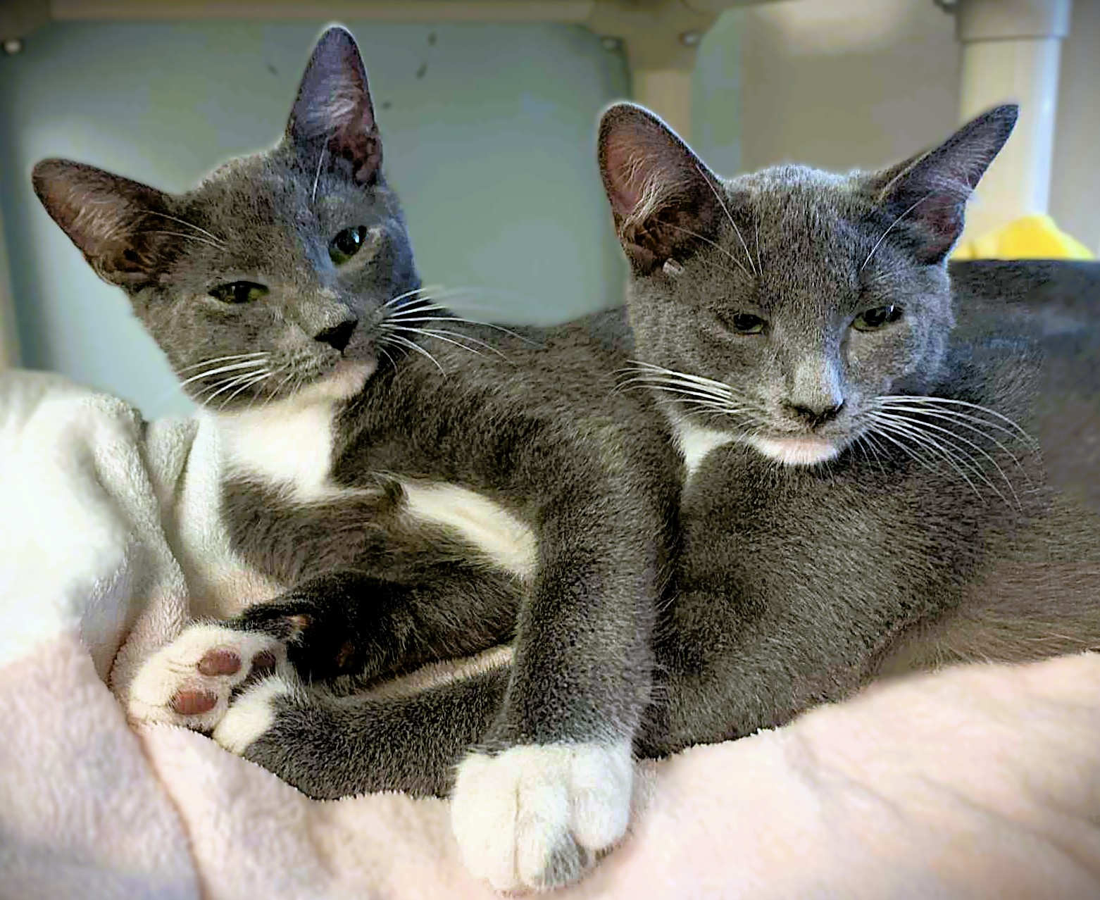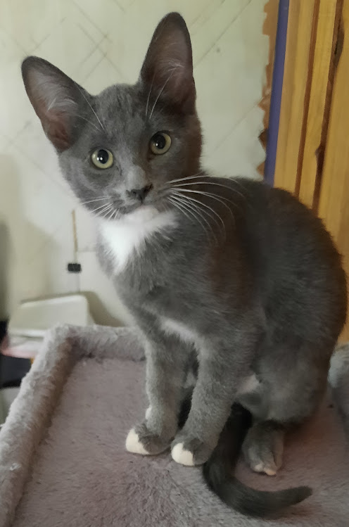 Hi, I’m Irene. My five sibs and I were rescued off the street when we were three months old. We were dirty, had fleas and worms, and were very scared. We got baths and flea treatment and then went to a foster home where we were treated for worms and given lots of good food and TLC. We are now in tip-top condition and ready for our forever homes. I’m the petite one in my litter. I’m very confident and friendly, and I’ll come up to you for attention and pets. I’ll also purr when you hold me. I love to play with my sibs, but have an independent streak too. I’m not as wild as some of my sibs, but I do like to play with them. My foster home had dogs, and I saw them through the glass door and was intrigued. I might be fine with a dog in my forever home, and I might be OK as an only kitten, but I think I’d be happiest with another kitten for a playmate. That’s my brother, Istanbul, with me in one pic. He has found his forever home, but I’m still waiting!