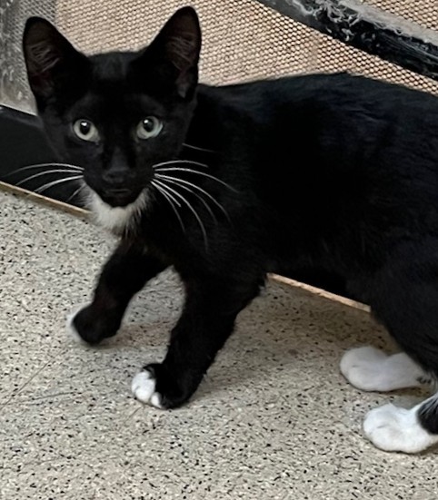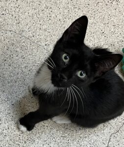 Hi, I’m Abba. My four sibs and I were rescued from a backyard when we were three months old.  I’m a friendly, playful kitten and also a cuddly purr machine.  I’m pretty good at climbing up legs, and I love sitting in laps.  I’m now ready for my forever home and would love to go home with one of my sibs or with another kitten or young cat.