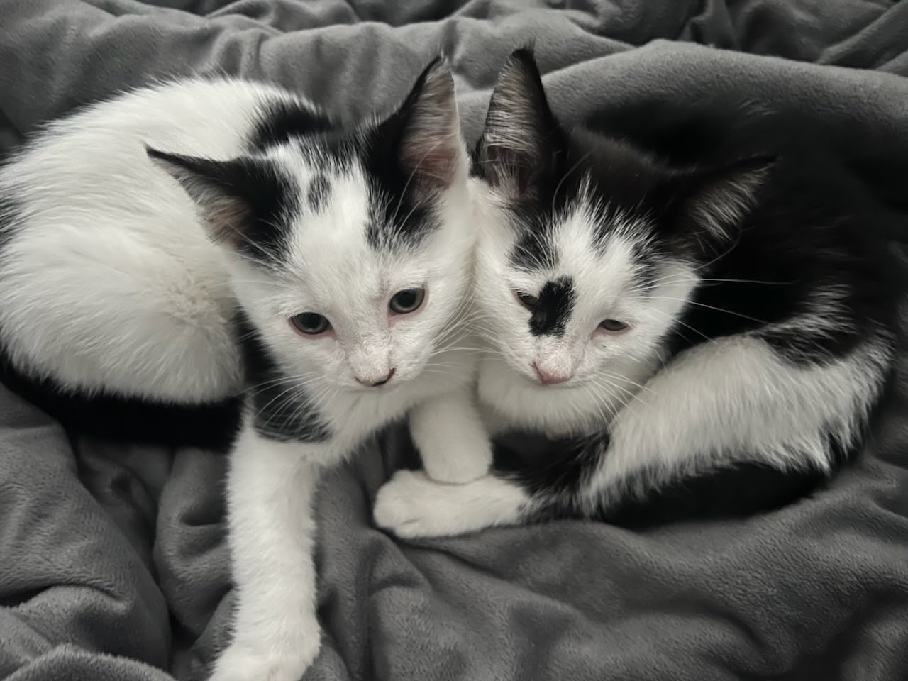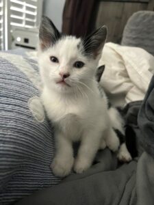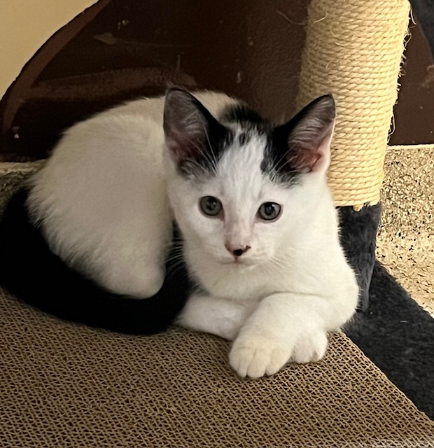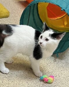 Hi, I’m Ariel.  My sibs and I were born in our foster home.  Our foster Mom had rescued our Mama from the street, so we were raised by our real Mama with help from our foster Mom.  I am the smallest, but I was the bravest when we came back to SBACC from our foster home.  I was out playing and exploring while my brother and sister stayed in our carrier.  I’m a friendly, playful, and affectionate kitten who enjoys attention and pets.  I am now ready for my forever home and would be extra happy if I could go with one of my sibs or another kitten or young cat. I’m with my sister, Athena, in one of the pics.