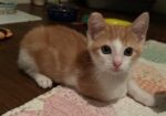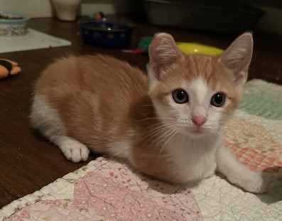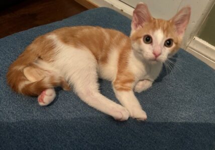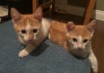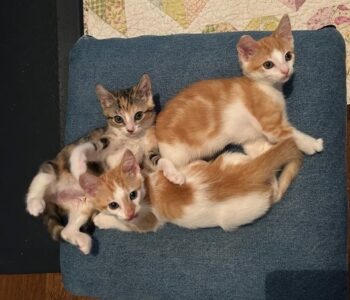 Hi, I’m Atticus. I was found with my sister and brother under a truck when we were about five weeks old. I was born with a birth defect – I’m missing some bones in my right front paw. I don’t put much weight on it when I walk and run. My foster mom said, I skip – thus she nicknamed me Skippy. It certainly does not keep me from keeping up with my siblings or the big cats in my foster home. I’m super lovable and cuddly. I love being held like a baby and will crawl into an open lap. I love to run around and play with anything that moves, especially the mouse on the wire. That is super fun! Empty toilet paper rolls are the best for swatting and chasing. I would love to be adopted with one of my siblings or another kitten or young cat, but I would be perfectly fine by myself as long as my new family gives me lots of love and cuddles. I’m with my brother in one pic and with both my brother and sister in another.