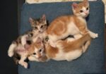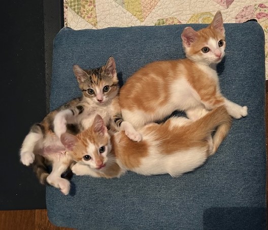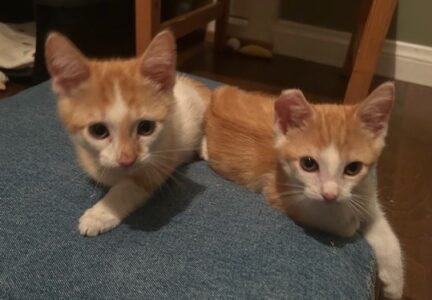 Hi, I’m Augustus. I was found with my sister and brother under a truck when we were about five weeks old. I’m super lovable and cuddly. I love being held like a baby and will crawl into an open lap. I love to run around and play with anything that moves, especially the mouse on the wire. That is super fun! Empty toilet paper rolls are the best for swatting and chasing. I would love to be adopted with one of my siblings or with another kitten or young cat, but I would be perfectly fine by myself as long as my new family gives me lots of love and cuddles. I’m with my brother in one pic and with both my brother and sister in another.