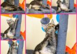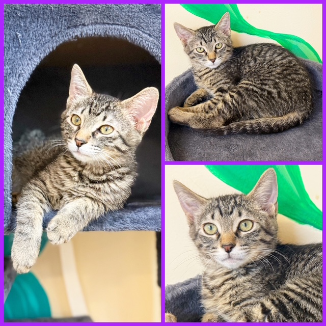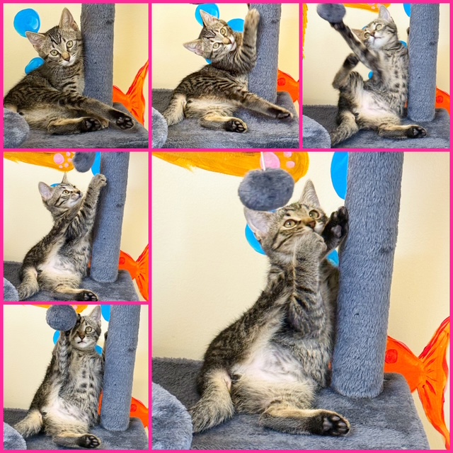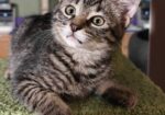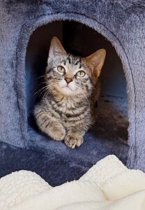 Hi, I’m Coraline. My brother, Chimmy, and I were about five weeks old when we were rescued from under a house. We came to SBACC and then went to a foster home.  I  was very timid and scared, and hissed a lot when I first came to my foster home. Once I got comfortable, I became pretty brave and curious.  My foster Mom says I found my moxie. I’m still wary of being picked up, but once you have me, I’m easy to hold. I have a soft purr.  I like to climb, and my brother and I love to play and tumble around together. I don’t like being alone, and I’ll cry if I can’t find my brother.  I need to go to my forever home with another kitten, hopefully, my brother.