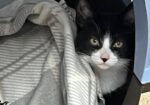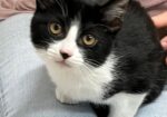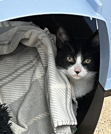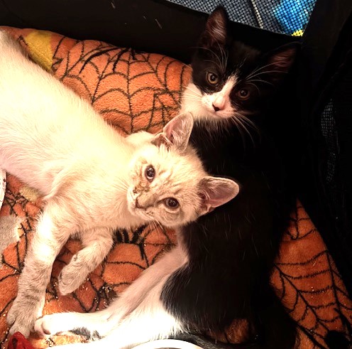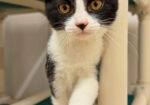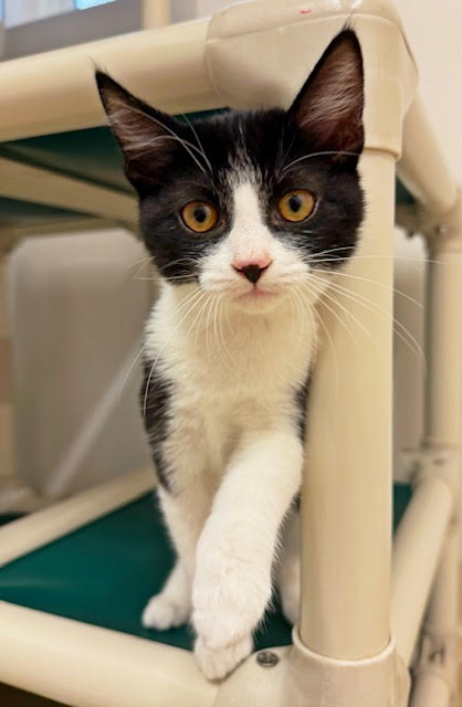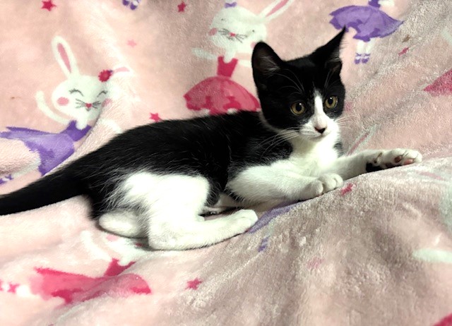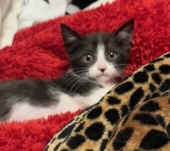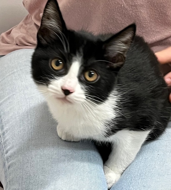 Hi, I’m Duchess. I was all alone and hiding under a car when I was rescued. I was only three weeks old and was scared and dirty in pretty bad shape, with tons of fleas, a runny nose, and goopy eyes. I came to SBACC, where I was all cleaned up, and then I went to a foster home. My foster home had some grown-up cats, and after about a month, another kitten, just about my age, came to join me. She had also been found all alone. We played and cuddled together, and also with the older cats. I’m shy in new places and with new people, but once I warm up, I enjoy being held and cuddled. I also have lots of energy, so having another kitten or young cat in my forever home would be ideal.