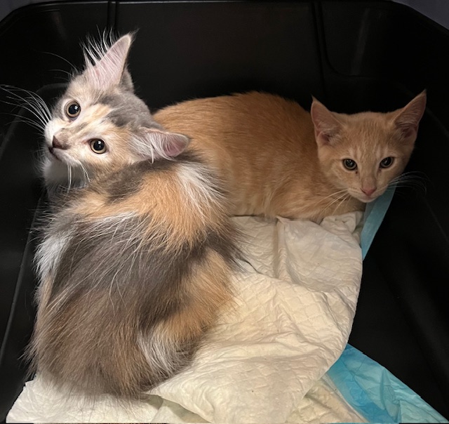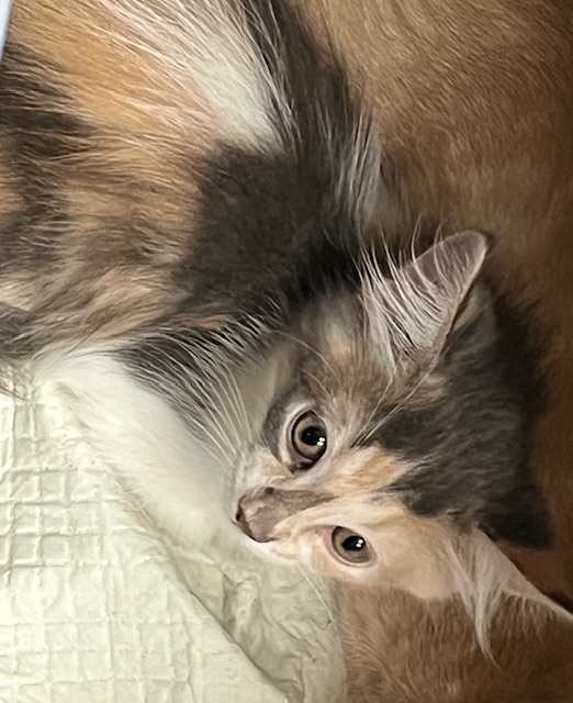 Hi, I’m Eloise. My two siblings and I came to SBACC in our Mama’s belly and were born five days later in her foster home. We have never spent a day on the street and were cared for and loved by both our Mama and our foster Mom. My foster Mom calls me a true beauty queen. I’m not as shy as my sister Emily, but not as outgoing as my brother, Earl Grey. I’m very playful and enjoy cuddling with my sibs, but not yet into cuddling with people. That will probably change with time. I’m now ready for my forever home and might be OK as an only kitten, but would probably be happier if I had a furry buddy, maybe my sister or another kitten or young cat. I’m with my sister, Emily, in one of the pics.