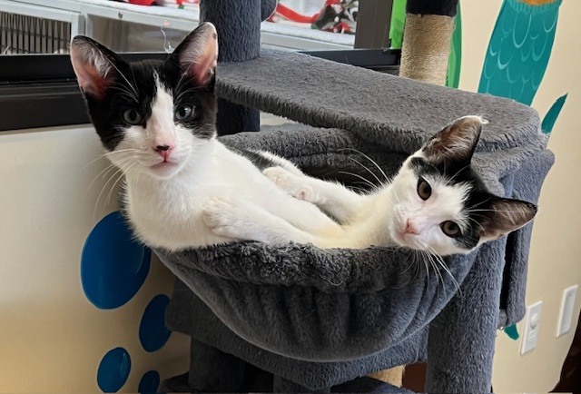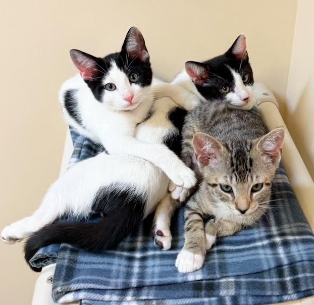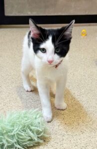 Hi, I’m Eunbin.  My five sibs and I were five weeks old when we were rescued from a backyard and brought to SBACC. Three of us went to one foster home, and three of us to another.  We got lots of TLC from our foster family.  I’m a friendly, playful kitten who loves to climb.  I also like to cuddle, and I enjoy tummy rubs.  I haven’t been around little kids or dogs, but my foster Mom says I’d probably be okay with either.  I’m pretty independent and could probably be an only kitten, but it would be much more fun to go to my forever home with one of my sibs or another kitten or young cat.  I’m with two of my sibs in one pic and in a collage with my brother Euntak in another.