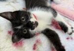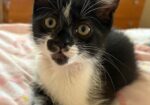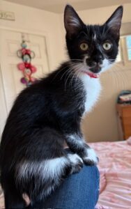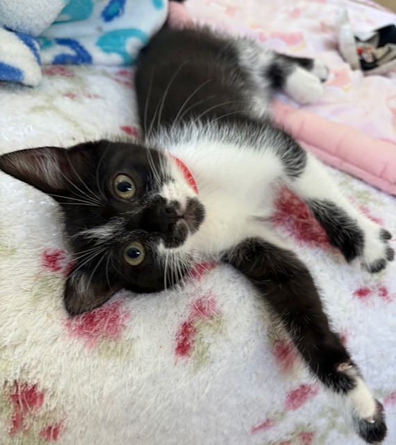 Hi, I’m Felicity. My three sibs and I were found under a tree in someone’s backyard. We were about 3-4 weeks old, and our Mama was nowhere to be found. We were brought to SBACC and then went to our first foster home, where we were bottle-fed until we could eat on our own. Then we went to another foster home and a third one when Foster Mom #2 went on vacation. My foster Mom says I’m a pure diva. I will tell you how it is with little meows. I love to nap in fuzzy blankets and will orient them just right. I love to climb, run, and pounce with my siblings, and I’m the first one out of the room when the door is opened. When it is time to rest, I love to cuddle. I’m a lap kitten and love belly rubs. I have a lot of kitten energy and would love to go home with another kitten or young cat so that I will always have a playmate.