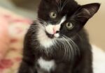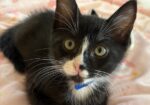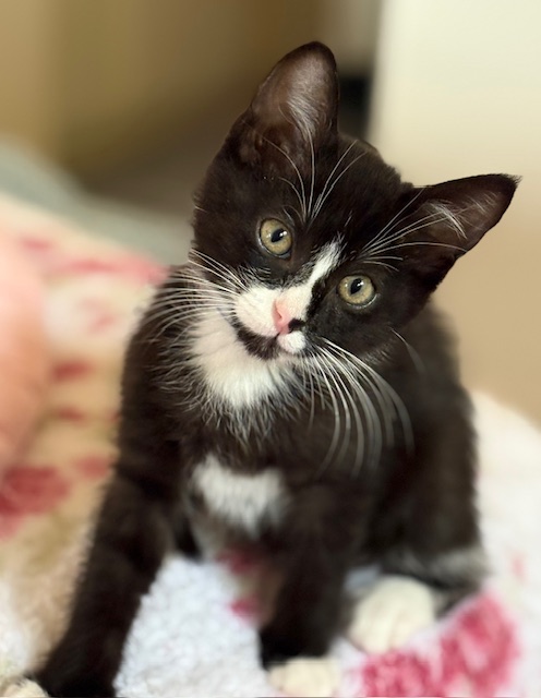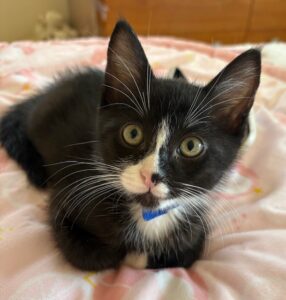Hi, I’m Frankie. My three sibs and I were found under a tree in someone’s backyard. We were about 3-4 weeks old, and our Mama was nowhere to be found. We were brought to SBACC and then went to our first foster home, where we were bottle-fed until we could eat on our own. Then we went to another foster home and a third one when Foster Mom #2 went on vacation. My second foster Mom decided she had to keep me forever, and I will have four young feline sibs in my home. What more could a kitten hope for?