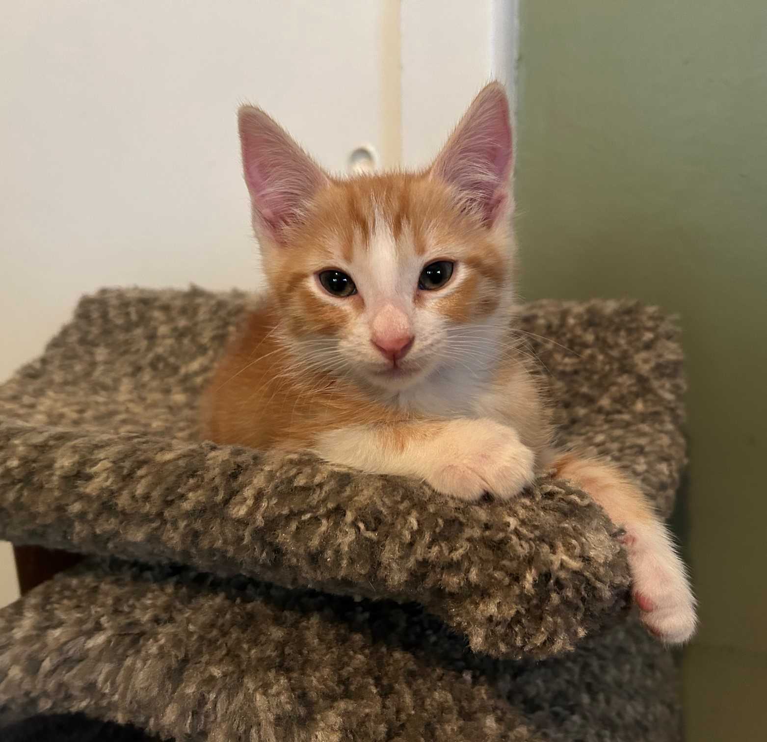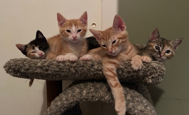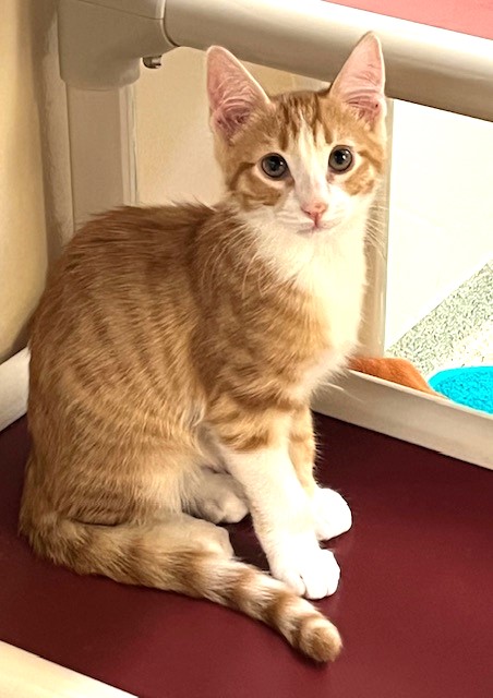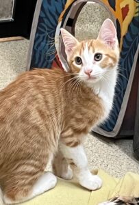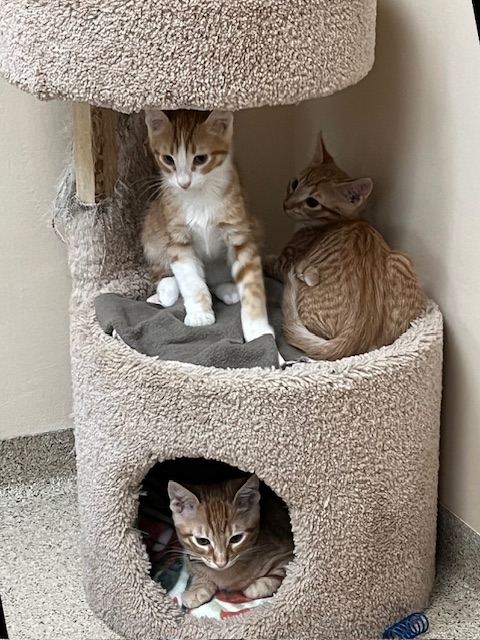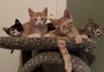Hi, I’m Geppetto. My five littermates and I came to SBACC when we were four weeks old, and then went to a foster home. I am super lovable and love being cradled like a baby in my foster mom’s arms. I was her favorite, and if she hadn’t already had three cats, she would have kept me forever. I love to run around and play with anything and everything. Climbing the cat tree and running around the house is super fun. I am very friendly and would love a home with another cat or kitten so we can play and cuddle together. When we are fed, I am always the last one to dinner. My foster mom says that I am always late to the party, but I like to take my time getting to the food. Come and meet me, and I am sure you will fall in love and want to take me home with you. I’m with one of my brothers and two of my sisters in one pic and with both of my brothers in another.