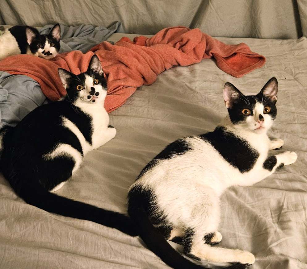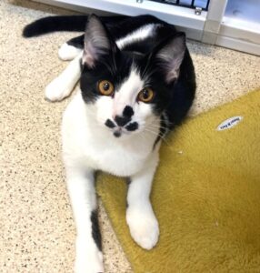 Hi there, I’m Great Googly Moogly. My four sisters, two brothers, and I were living in an alley and being fed by a very nice lady for nearly a month. She wanted a better life for us, so she gathered us all up and brought us to SBACC. My two brothers and I went to a foster home, got a nice bath and meal, and had plenty of cuddle time! I’m the biggest in my litter and have a lucky four-leaf clover on my face! I don’t let it get to my head, though. I’m a gentleman but a little on the shy side, so approach me slowly when you meet me. I love to play and cuddle, and I’m fine with being picked up! I love all my siblings, but I’m especially bonded to my brother, Groucho Garlic Bread. We play and sleep together more than the other kittens. I would really like to go home with him, but any of my other siblings or other kittens would work too. Groucho Garlic Bread is behind me in one of the pics, and one brother is on each side of me in another.
