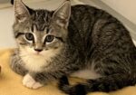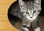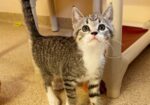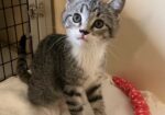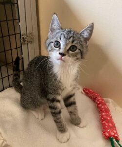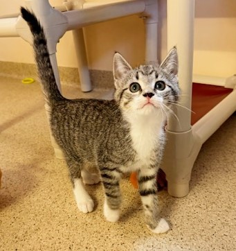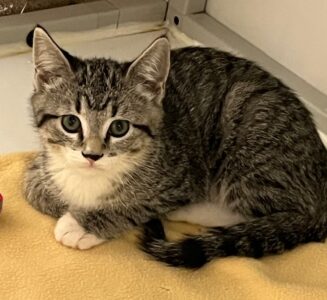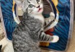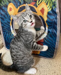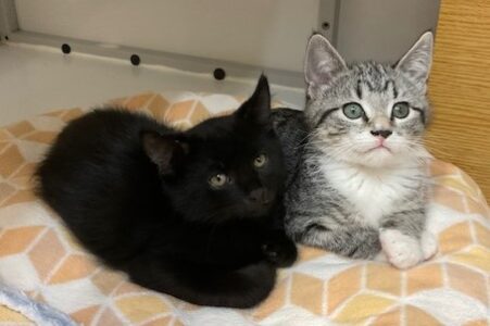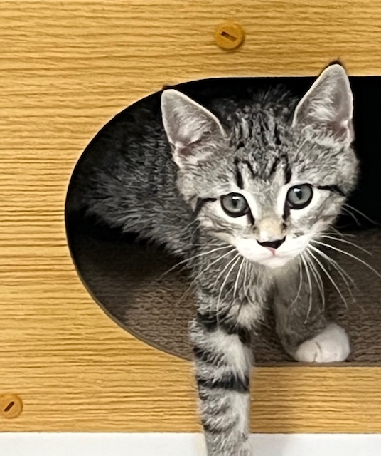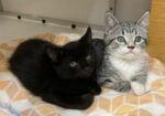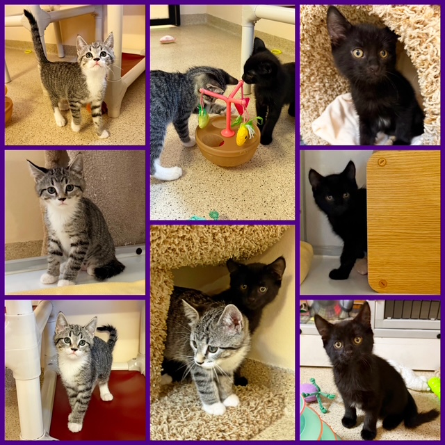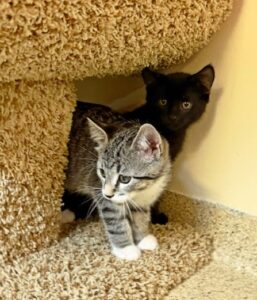Hi, I’m Haein. My brother, Hanbin, and I were 3-4 weeks old and hiding in the bushes when we were rescued from someone’s backyard and brought to SBACC. We were dirty and full of fleas, but we were all cleaned up and sent to a foster home where we got lots of TLC and good food. We both love to play and explore new things. We’re gentle with our humans but sometimes get a little rough with each other. We have lots of energy, but when we’re worn out, we become cuddly, affectionate kittens, and you’ll hear us purr. We’ll even let our people pick us up and carry us around. We’re now ready for our forever homes and hope we can go together or with another kitten or young cat. I know I’ll get very lonely without a furry buddy and really don’t want to be an only kitty. That’s my brother behind me in one pic and next to me in another. I’m a little braver than he is.