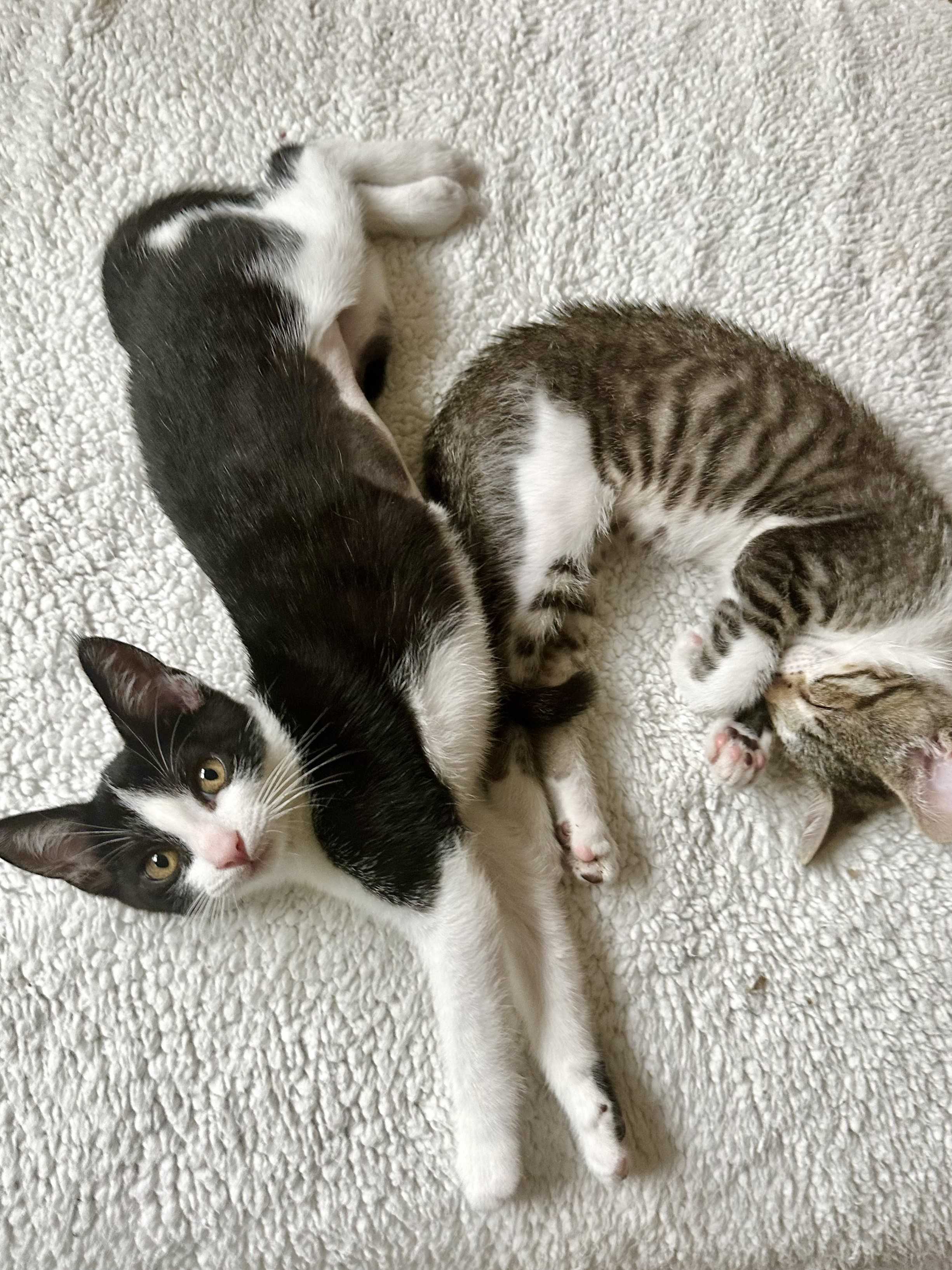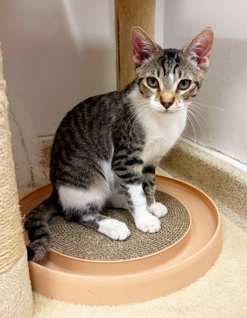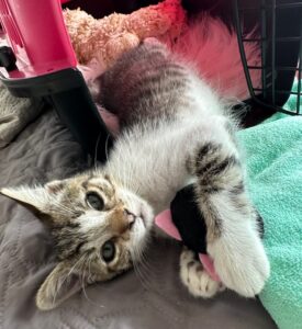 Hi, I’m Hank.  I was all alone and only four weeks old when I was rescued from someone’s front porch on a rainy day. I spent a couple of days at SBACC, then went to a foster home with three other orphaned kittens who were siblings. I’m an affectionate, playful, and social kitten. I’m small but mighty, with lots of personality and tons of energy.   When I’m worn out from playing, I would cuddle with my foster parents and kitten friends. I enjoyed the cat-friendly dog and adult cats at my foster home. I need to go home with another high-energy kitten or to a home with another kitten or young cat who wants to run, chase, and play.  I’m with my foster sister, Gracie, in one of the pics.