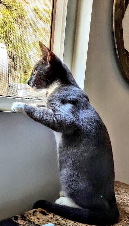 Hi, I’m Istanbul.   My five sibs and I were rescued off the street when we were three months old.  We were dirty, had fleas and worms, and were very scared.  We got baths and flea treatment, and then went to a foster home where we were treated for worms and given lots of good food and TLC.  We are now in tip-top condition and ready for our forever homes.  I’m the most rambunctious and curious of my litter. I would come running to my foster Mom as soon as she entered our room – I helped with litter box cleaning and food prep.  I love to look out the window and watch birds and bugs flying by.  I enjoy lots of activity and am fearless and always the first to try everything.   I have no problem being picked up and held, but my foster Mom says my manners need some work.  I probably would do fine as an only kitty, but having another kitty to roughhouse with would be much more fun.   That’s my sister, Irene, behind me in one pic.