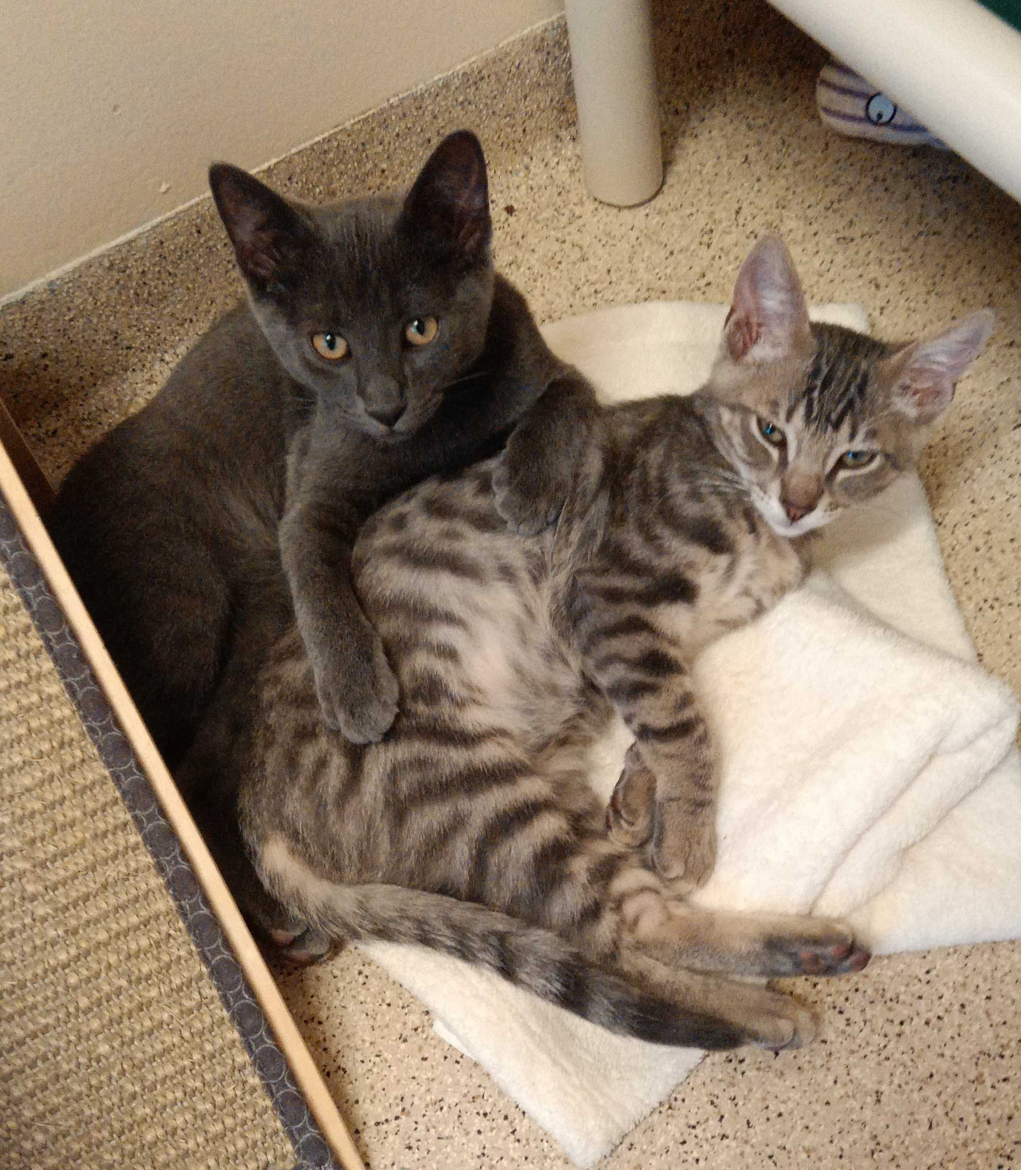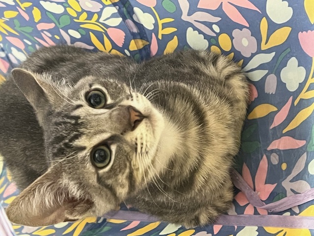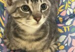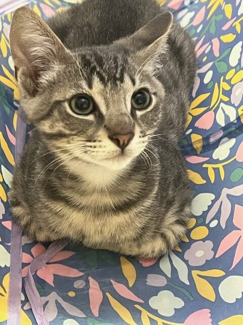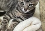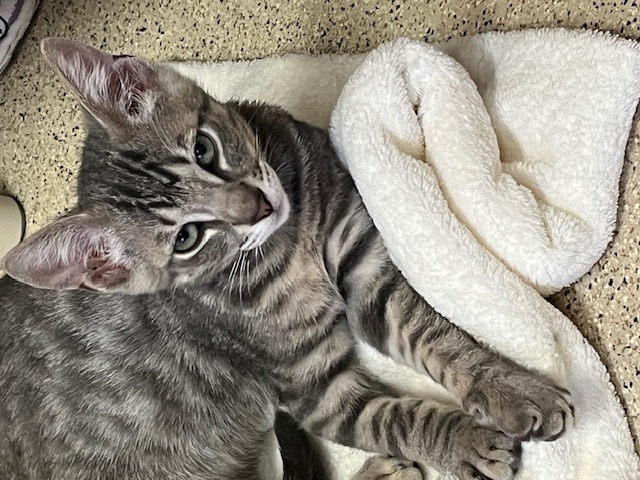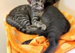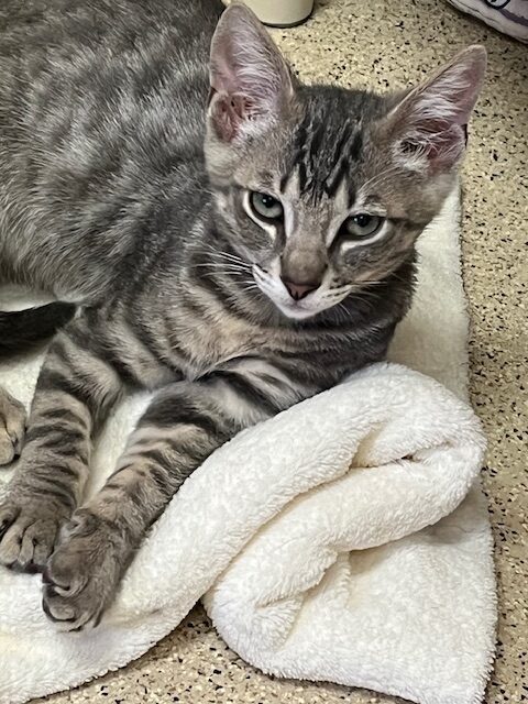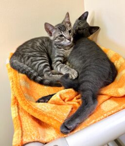 Hi, I’m Jackman. My brother, Jolie, and I were just four weeks old when we were rescued from the street. We had been hiding between two truck tires. We came to SBACC and then went to a foster home where we had lots of good food and TLC from our foster Mom and her two sons. My foster Mom says I’m a sweet ball of energy and an attention hog. I love to play with toys and my brother, and I must admit I can get a little rough when I play. I’m pretty rambunctious during the day, but will become a loving lap kitten at night when I’m all worn out from playing. I come running when I hear the pop of a can of food, and I might also come running when I see or hear a door open, so you need to watch your doors. I’m now ready for my forever home. I might do OK as an only kitten if I get lots of attention, but it would be much more fun to have a home with another kitten or young cat who will be a playmate. I’m with my brother, Jolie, in two of the pics.