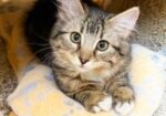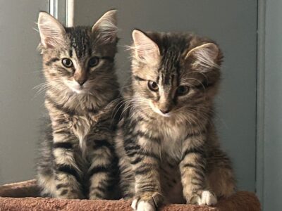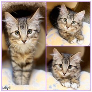 Hi, I’m Jekyll. My sister, Jigger, and I were rescued from a backyard when we were just two weeks old. We came to SBACC and then went to a foster home where we were bottle fed until we could eat on our own. We are both friendly, playful kittens who love to be held and cuddled. Laps are one of our favorite places. We are very attached to each other and need to go to our forever home together. We also look alike except that I have white toes and Jigger doesn’t.