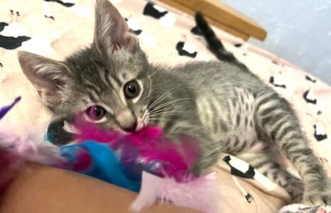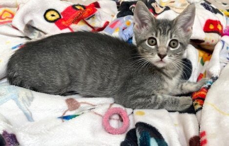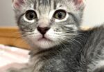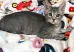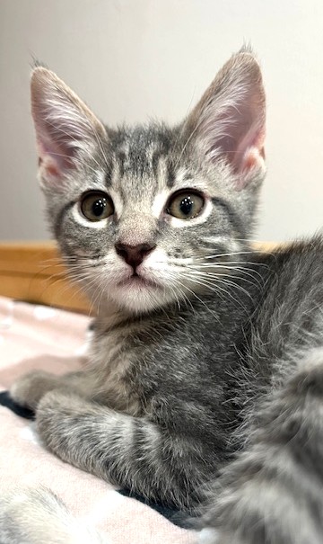 Hi, I’m Jespeon. My four sibs and I were about a month old and living under a house with our Mama when she disappeared. We were rescued and brought to SBACC, and then we went to a foster home. I’m a cooing little gray tabby who loves to come for cuddles and snuggles when you need some extra love. I love chasing balls and springs, playing with wand toys, and climbing my scratching post. I’m also a champion biscuit maker! I would love to find a home with one of my sibs or another young kitty to chase around.