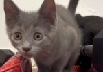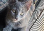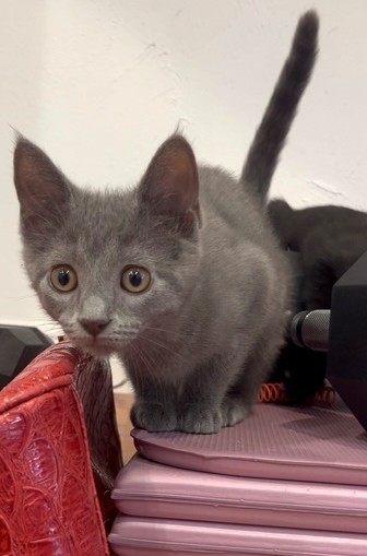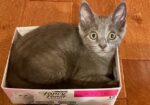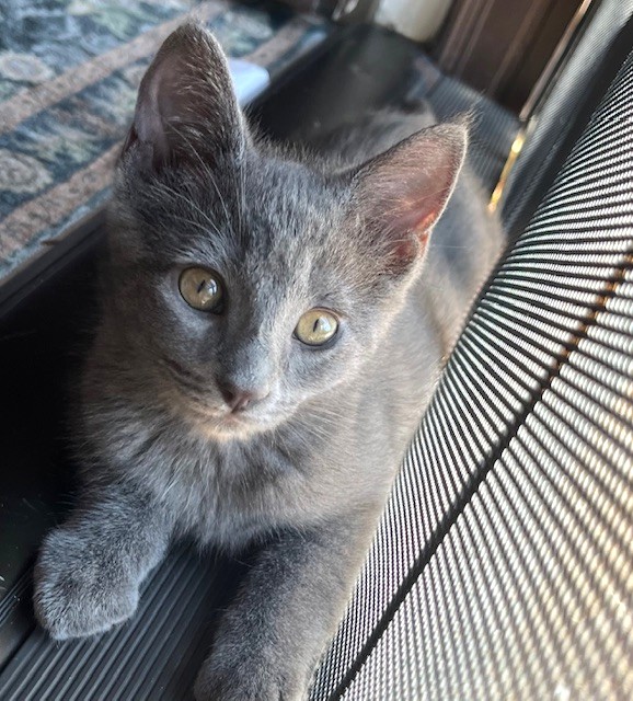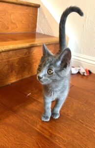 Hi, I’m Jynx.  My four sibs and I were about a month old and living under a house with our Mama when she disappeared.  We were rescued and brought to SBACC, and then we went to a foster home.  I’m a spunky, dark gray girl kitty. I’m a super cuddlebug who loves to follow you from room to room for snuggles and playtime. I’d love to spend the night sleeping by your side and wake you up with a meow and some nuzzles! Just wave some feathers, a wand, or toss me a toy to see me in action!  I would love to find my forever home with one of my sibs or another kitten or young cat.