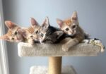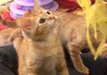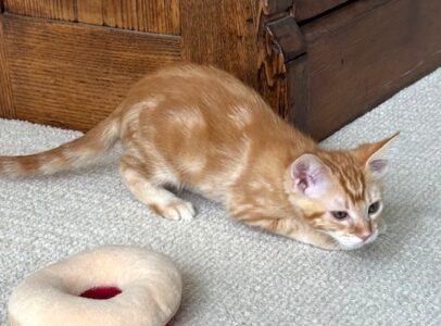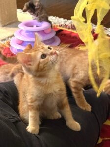 Hi, I’m Kimber. My three siblings and I were hiding under a car when we were rescued. We were just 3-4 weeks old, and our feral Mama had disappeared. We came to SBACC and then went to a foster home where we were syringe fed a slurry of formula and food until we could eat on our own. This is what my foster mom says about me: “Kimber is a sweet, ginger beauty with a lovely swirly-patterned coat. She has big, expressive eyes and a curious nature. She has a cute habit of chirping to herself when she plays with a toy she likes. She also loves a cuddle and a nap on a warm lap. She would do fine as an only pet, but would do great with a friend to play with.” All four of us are in one pic.