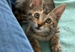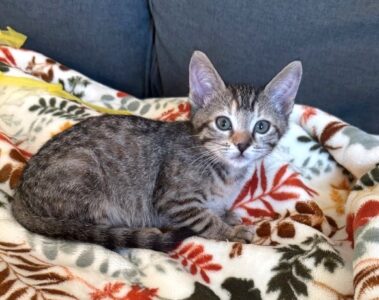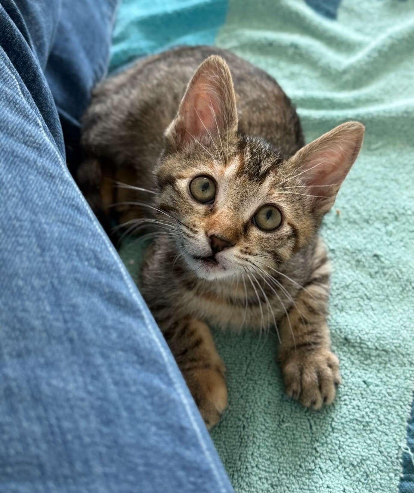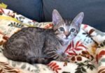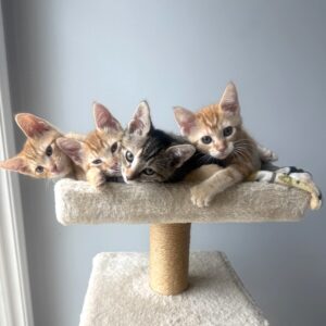 Hi, I’m Korra.  My three siblings and I were hiding under a car when we were rescued.   We were just 3-4 weeks old, and our feral Mama had disappeared.  We came to SBACC and then went to a foster home where we were syringe fed a slurry of formula and food until we could eat on our own. This is what my foster mom says about me: “Sweet little tabby girl Korra is a gentle, playful kitten.  She wrestles and plays with her siblings, but if they get too rough, she will watch the antics from the safety of a nearby lap.  She loves to be held and cuddled and to take naps on the cat tree.  I think she would love to go home with a family with other pets.” All four of us are in one pic.