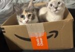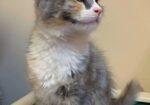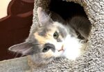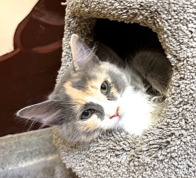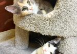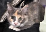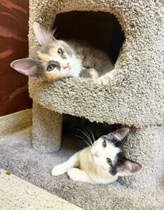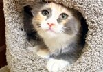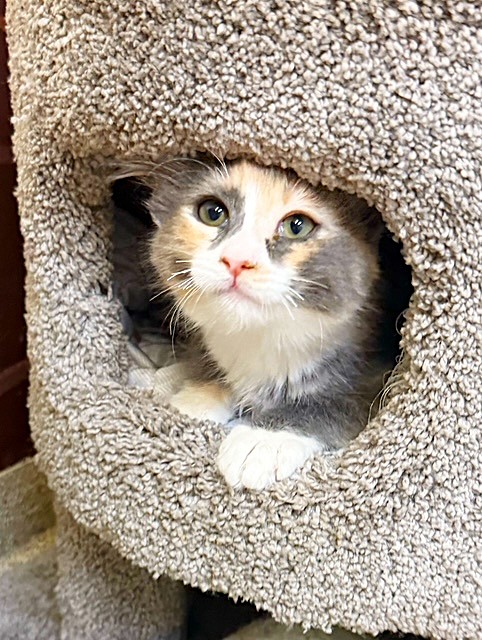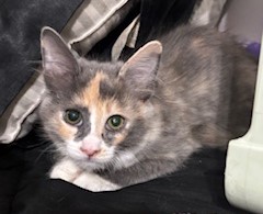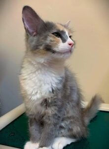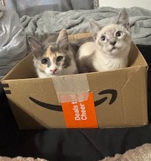 Hi I’m Kymira.  When we were just two days old, my two sisters and I were put in a child’s party hat and abandoned by some trash cans.  We were helpless, hungry, and cold when we were discovered and rescued by an SBACC employee, who became our foster Mom.  Sadly, one of my sisters didn’t survive, but Kimora and I did and are now playful, loving, and healthy kittens.  When Kimora and I were about seven weeks old, we were joined by two kittens our age.  They were brothers, DeVille and DeLorean, and we all became best friends. My foster mom says I’m a sweet, lovable kitten who loves to cuddle and will lick when I do! I could be the only kitten if someone has lots of time for me, but it would be more fun to have a buddy in my forever home. That’s DeVille in the box with me in one of the pics, and Muffin in another.