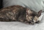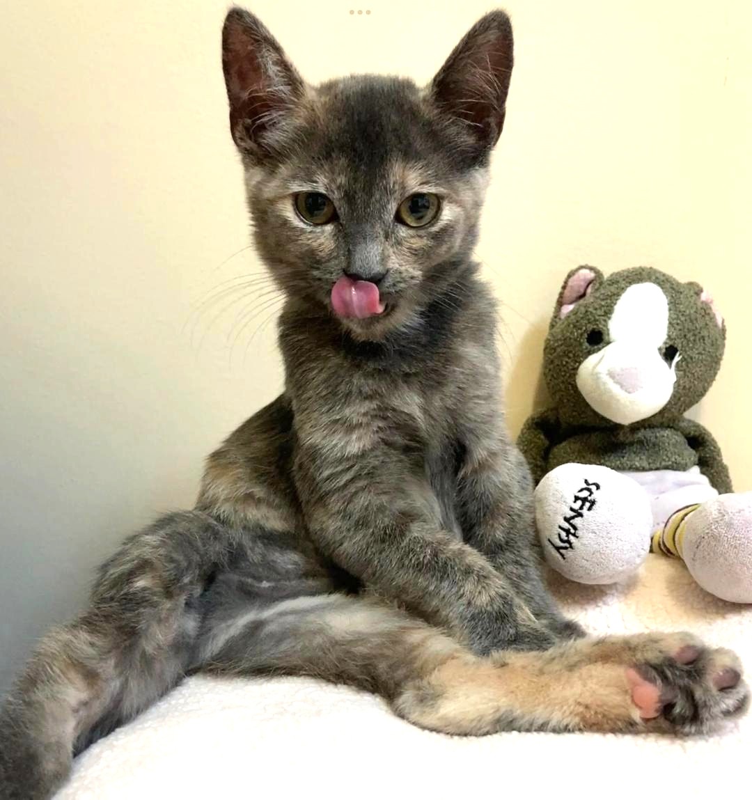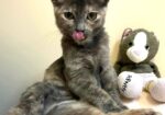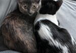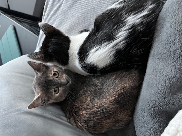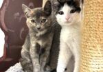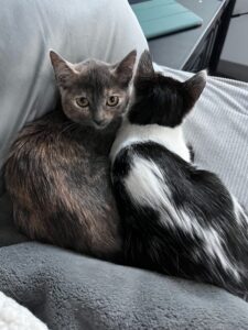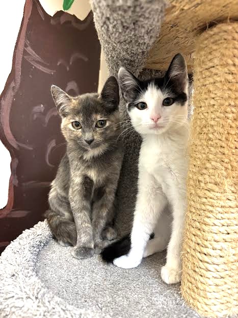 Hi, I’m Magpie. My sister, Muffin, and I were rescued along with our Mama when we were about three months old. We had all been living under a pallet behind a rescue mission. After arriving at SBACC, Muffin and I were placed in a foster home. We were not used to being around people and were pretty scared at first, but we got comfortable after a while. We like to cuddle and play with each other and with two other kittens in our foster home. We would sit next to our foster Mom and purr if she picked us up and put us next to her. Some day we might even be lap cats, but not quite yet. We’re looking for a quiet forever home and would love to go together. We’re together in two of the pics.