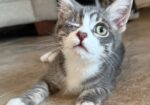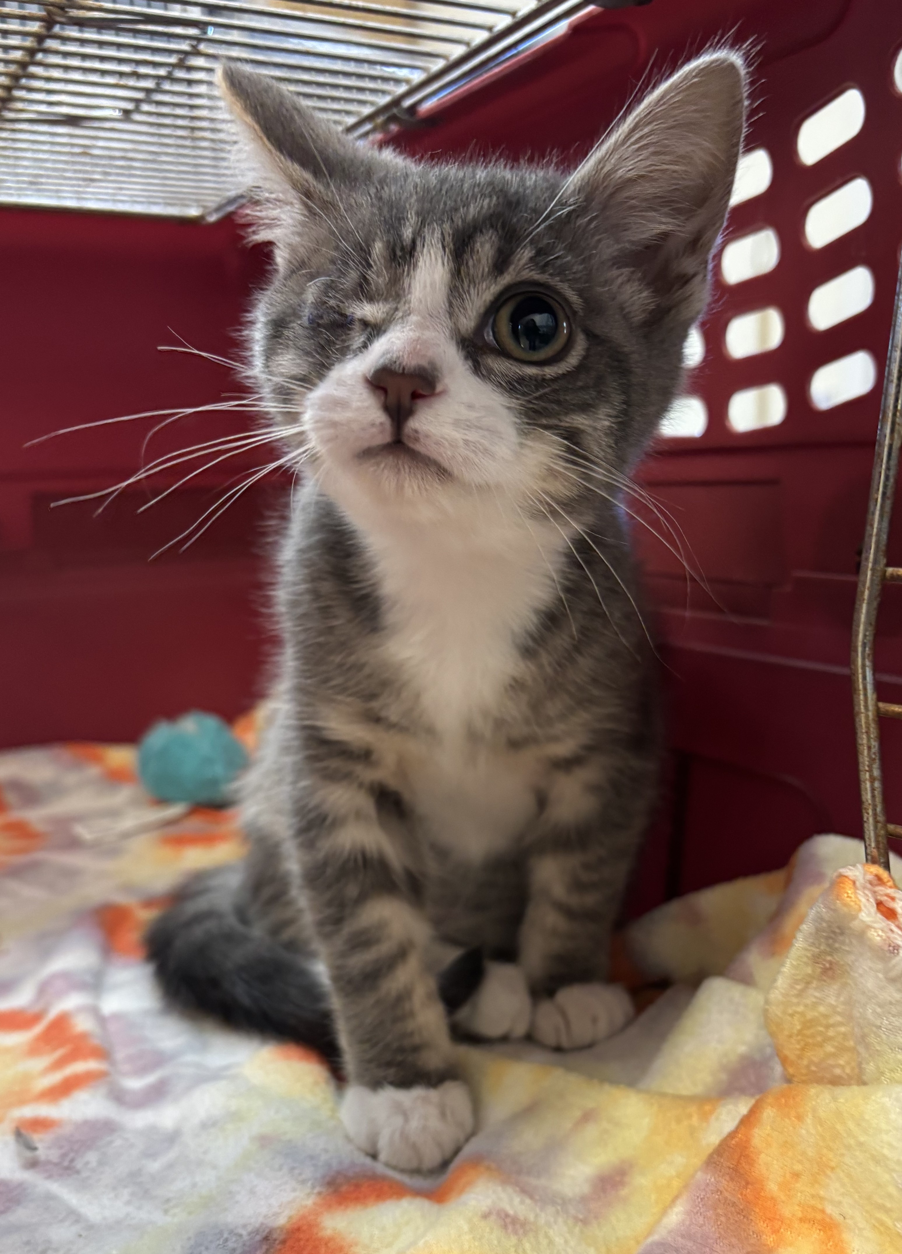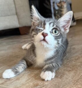 Hi, I’m Milo. I was all alone and hiding in some bushes beside someone’s house when I was rescued and brought to SBACC. Something was terribly wrong with one of my eyes, and the vet said it couldn’t be saved. I spent about a month in a foster home, and my foster Mom says I’m a very sweet, active, and vocal kitten. Having lost an eye isn’t slowing me down at all. I love to play and really need another kitten or young cat to play with, or I need a home where I’ll get tons of attention from my humans. When I’m all worn out from playing, I like to cuddle, and I become affectionate. I’m now ready for my forever home and hope to find one quickly!