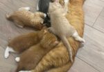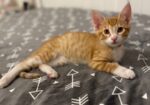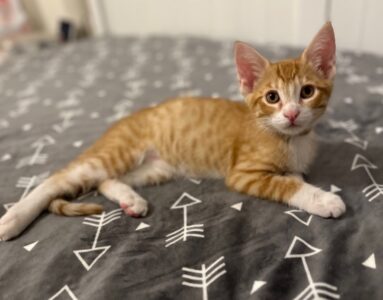 Hi, I’m Nick.  My four sibs and I came to SBACC in our Mama’s belly.  She went to a foster home, and we were born just nine days later.  We grew up in the best of two worlds. We had our Mama to feed and nurture us, and we were in a safe place where our foster Mom provided our Mama with all the food and care she needed to raise healthy kittens.  We’re all super playful and friendly. I’m also a lap cat who likes to be picked up and cuddled.  I’m now ready for my forever home!  I would probably be OK as an only kitten if I get lots of attention and love, but it would be much more fun to go home with one of my sibs or with another kitten or young cat.  That’s my Mama and all of us kittens in one pic.