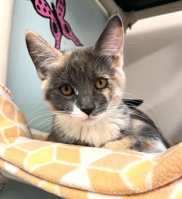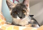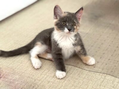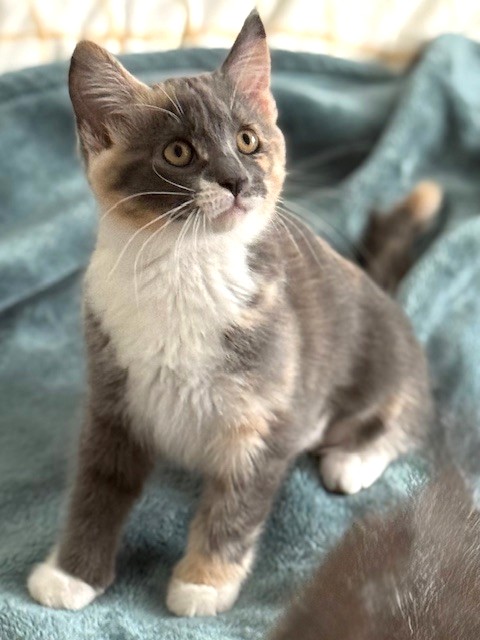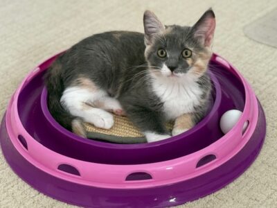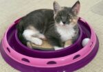 Hi, I’m Nutmeg.  My sister, brother, and I were hiding in the bushes in someone’s yard when we were rescued and brought to SBACC.  We were seven weeks old and pretty scared.  We spent about a month in a foster home where we got lots of TLC. I’ve had a hard time adjusting since I was the most scared, but my foster mom worked with me, and I do love to play! My brother and sister have both been adopted, but I’m still waiting. I’m no longer scared and timid, and would love a home with another kitten or playful young cat.