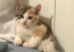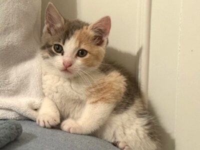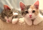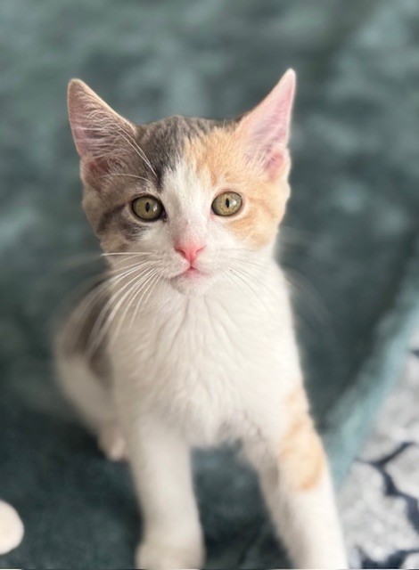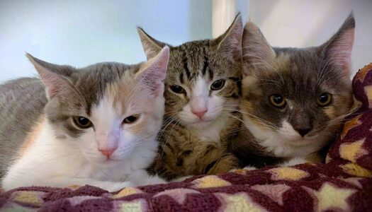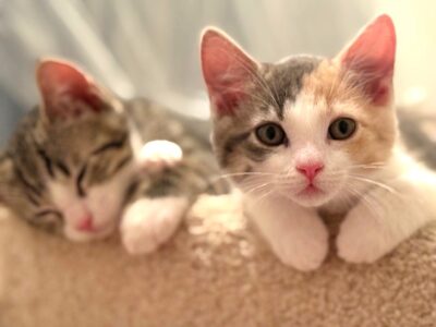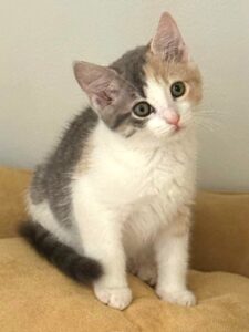 Hi, I’m Nyla. My sister, brother, and I were hiding in the bushes in someone’s yard when we were rescued and brought to SBACC. We were seven weeks old and pretty scared. We spent about a month in a foster home where we got lots of TLC. I adjusted to my foster home very quickly. I love being held like a baby and having my tummy, head, and neck scratched. I also love to play with toys and with my sister and brother. My foster mom says I have the softest fur and will likely adjust to any home, as I’m just the sweetest! I’m with my brother Noodle in one photo, and all three of us are in another.