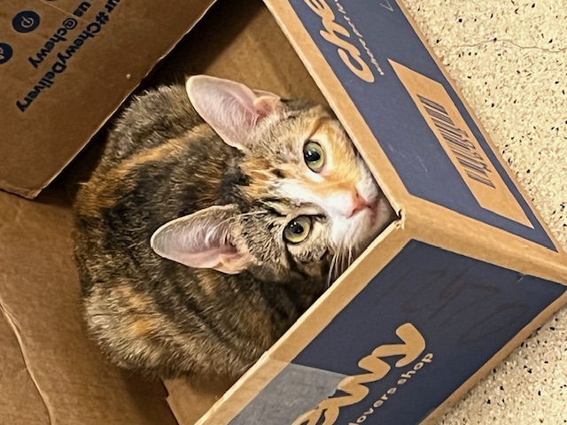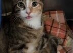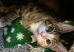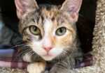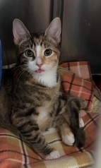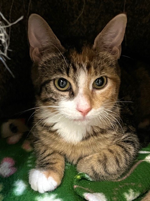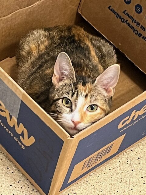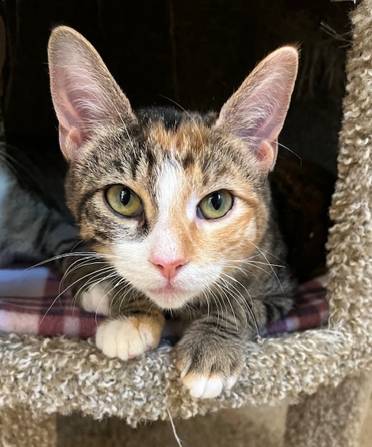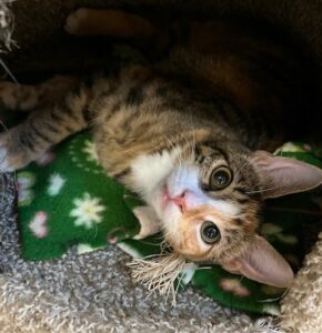 Hi, I’m Octavia. I was rescued from a backyard alley, along with my two brothers, when we were six weeks old. We were all treated for fleas and worms when we arrived at SBACC. I may be a little shy at first, but I warm up quickly and am a friendly and playful kitten. I enjoy attention and pets and love cardboard boxes. I’m finally ready for my forever homes and hope I don’t have to wait too long. I’d be happy to go home with one of my brothers or another kitten or young cat.