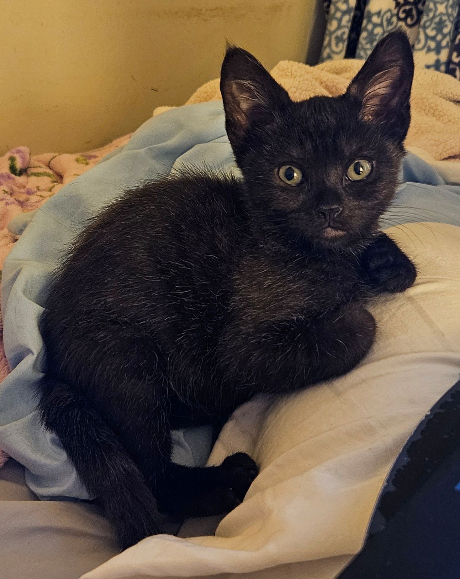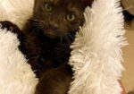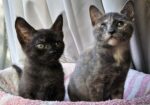 Hi, I’m Oden. We were just three weeks old when my two sibs and I were rescued from a kill shelter along with nine other kittens. We each went to several different foster homes along with our sibs. My sibs and I were in terrible shape, with mange, respiratory and eye infections, and intestinal parasites. We got lots of good food, TLC, and the medicine we needed to fix us all up in our foster home. We are now healthy, happy kittens and ready for our forever homes. We’re all super playful, cuddly, talkative, and polite (or as polite as a kitten can be!). I’m super cuddly and will rub all over you to get your attention. I play hard, sleep hard, and love to cuddle up with my foster Mom or my siblings. I’m not afraid of water either and will sometimes join my foster Mom in the shower and play lifeguard! I’ll just walk through the water, get sprayed, and not have a care in the world. I’ll even tell my foster about my day while I’m getting soaked! After the shower is over, I make no complaints about getting bundled up and dried off. I would love to go home with one of my sublings or another kitten or young cat! I’m with my sister, Ooopsie, in one pic.