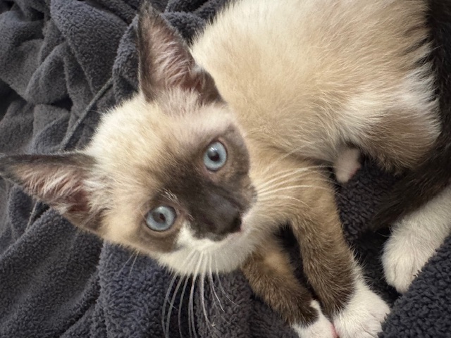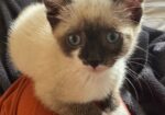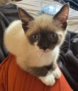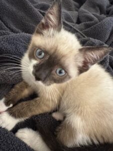 Hi, I’m Otis. I was all alone and just four days old when I was rescued from someone’s yard. I was brought to SBACC and then went to a foster home where I joined another orphaned kitten who had been rescued about two weeks earlier and was only two weeks older than I was. We became buddies and playmates as we grew. I also became a lover boy and a cuddler who loves to give kisses. Friends of my foster Mom are adopting me, and I will have a young feline brother and their two young children to play with.