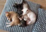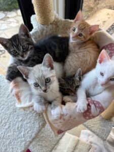 Hi, I’m Pippin.  My Mama was pregnant when a nice family let her in after showing up at their back door.  She delivered my five siblings and me to their home a few days later.  When we were about four weeks old, we all came to SBACC and then went to a foster home.   My foster Mom says I’m a curious, smart, and beautiful kitten.  I like to play with my sibs, but I also like quiet time by myself.  Sometimes I’m a cuddly lap kitty, and other times, I’d rather be by myself.  I’m now ready for my forever home and would be OK as an only kitten, but I’d also be fine having another kitten or cat in my home. I’m in a cuddle puddle with my sibs in two of the pics, and all of us are with Mama Piper in another pic.