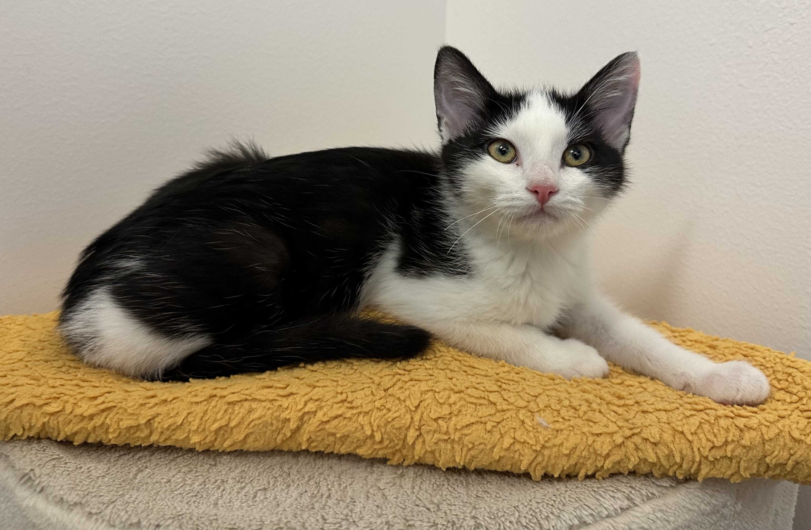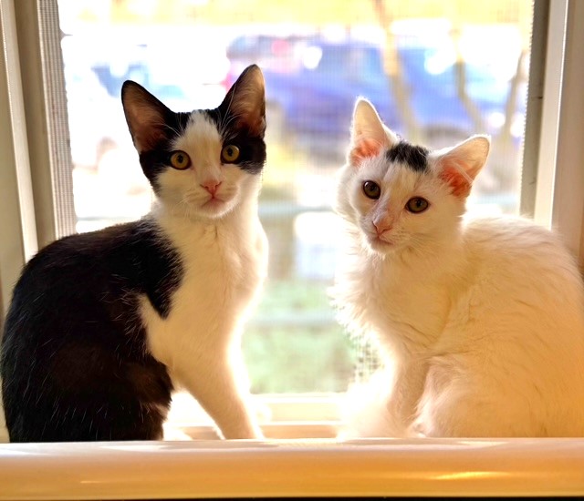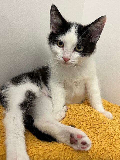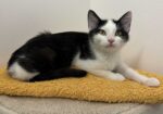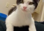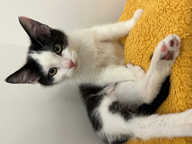 Hi, I’m Ravioli. I was about nine weeks old when I was rescued from a gas station. I came to SBACC, then went to a foster home, where I joined Quiche, who was a few weeks younger than me and had been rescued just the day before. We became buddies. My foster Mom says I’m the perfect kitten, playful, active, and loving. I loved lying on her chest and getting lots of cuddling. I also like to play and was able to hold my own with my foster brother, Wafer, who was older and bigger than me. I would probably do OK as an only kitten, but would much rather have a forever home with Quiche or with another kitten or young cat, and maybe some children too. I’m with my foster sister, Quiche, in two of the pics.