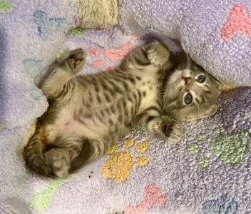 When I’m not playing with other kittens, you can find me cuddled up on my foster mama’s lap, and lately I’ve been snuggling with my foster mama’s blind two-year-old cat. I would love to find a Forever Home that already has a playful cat or go home with another kitten or young cat.