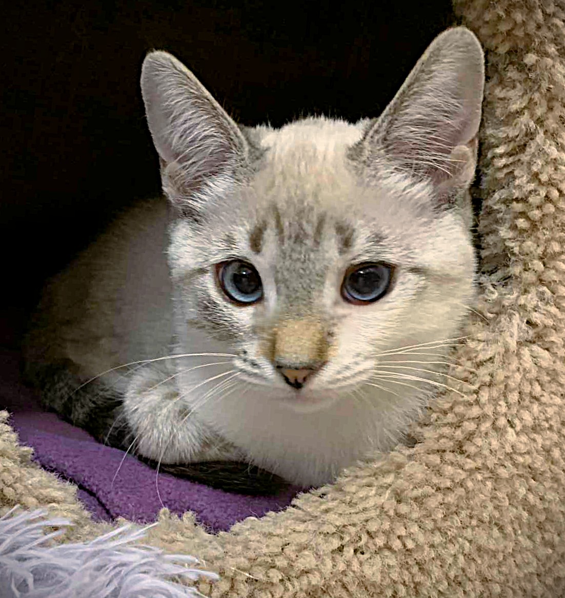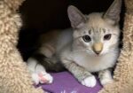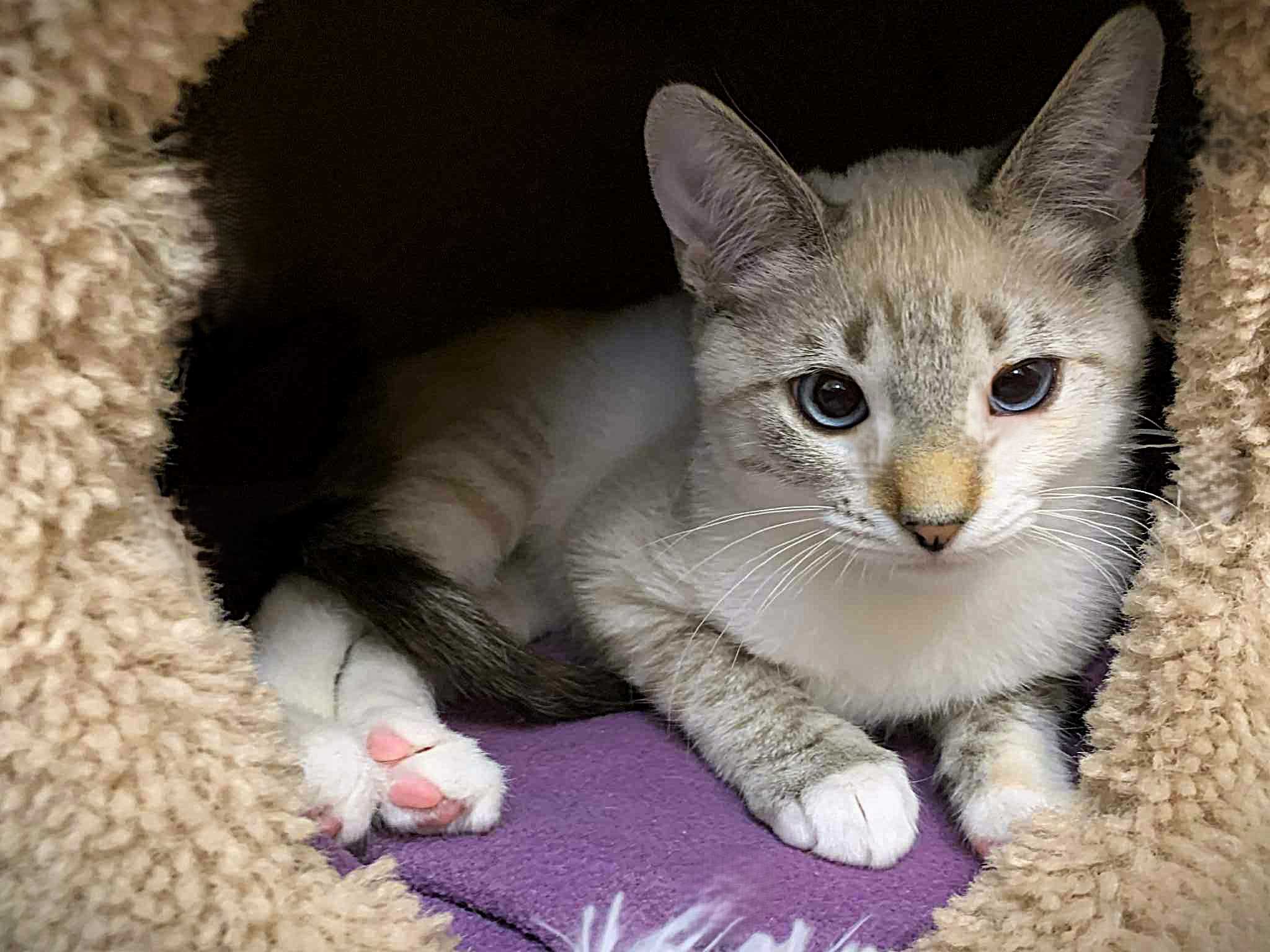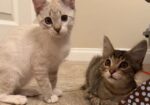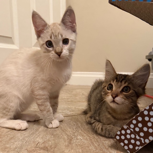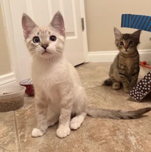 Hi, I’m Sassy.  My brother, Story, and I, along with our sister and two other kittens, were rescued from an alley behind a homeless shelter. We were about two months old and barely alive.  We were severely malnourished,  infested with fleas and worms, and our eyes were sealed shut from infection.  Sadly, our sister passed away, and there were other kittens in the alley who had already passed. It took us almost two months to recover, but with the help of medicine, good food, and excellent care, we did, and are now happy and healthy kittens.  We are playful and friendly kittens and are very bonded to each other, so we need to go to our forever homes together.  This is what our foster Mom has to say about me.  “Sassy is such a beautiful girl. She is shy at first but warms up quickly and is very loving. She will lean her whole body against you for pets and will snuggle right up beside you.”  Story and I love wrestling with each other and playing with the mouse-on-a-string and Pompoms. We do everything together, playing,  eating, and snuggling up beside one another to sleep.  That’s why we need to stay together.