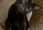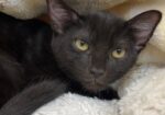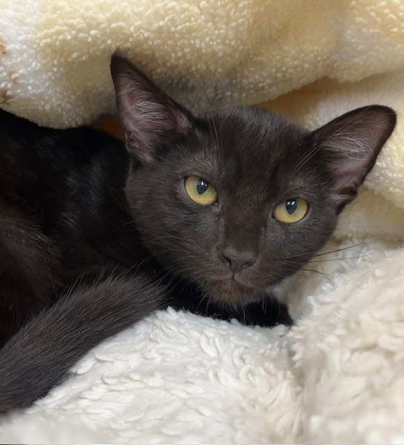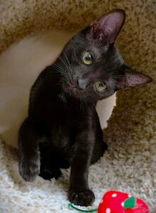 Hi I’m Tinsel. My three sibs and I were rescued from a backyard when we were about five weeks old. We came to SBACC and then went to a foster home. We were very scared and weren’t in the best of health. We had goopy eyes, were all congested, and were discovered to have intestinal parasites. So we all needed lots of medicine to get better. It took a while, but we are finally in tip-top shape. My sister, Twig, and I are still shy and take a while to warm up to new people. However, we are both sweet, playful kittens. We are now ready for our forever homes, and it would be extra special if we could go in pairs or with another kitten or young cat. I’m with my two sisters, Twig and Tink, in one pic.