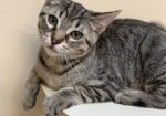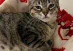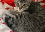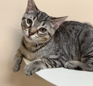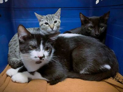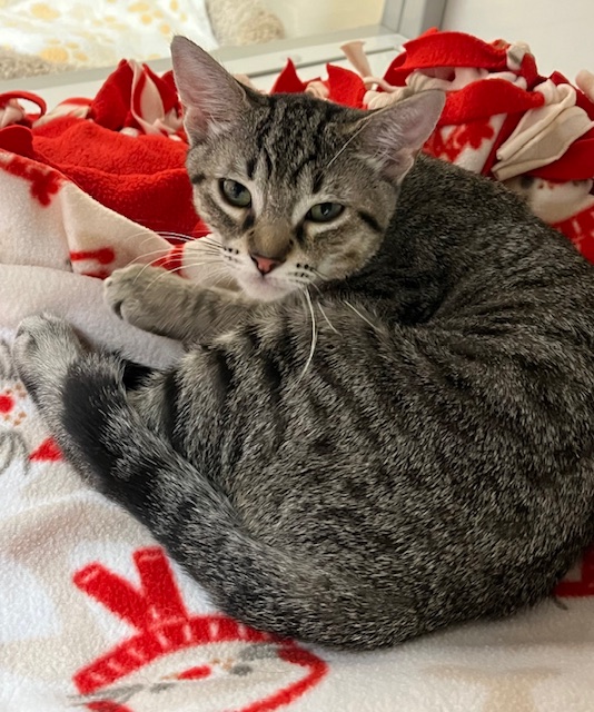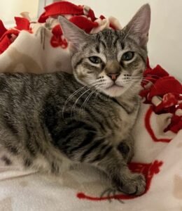 Hi I’m Twig. My three sibs and I were rescued from a backyard when we were about five weeks old. We came to SBACC and then went to a foster home. We were very scared and weren’t in the best of health. We had goopy eyes, were all congested, and were discovered to have intestinal parasites. So we all needed lots of medicine to get better. It took a while, but we are finally in tip-top shape. My sister, Tinsel, and I are still shy and take a while to warm up to new people. However, we are both sweet, playful kittens. We are now ready for our forever homes, and it would be extra special if we could go in pairs or with another kitten or young cat. I’m with my two sisters, Tinsel and Tink, in one pic.