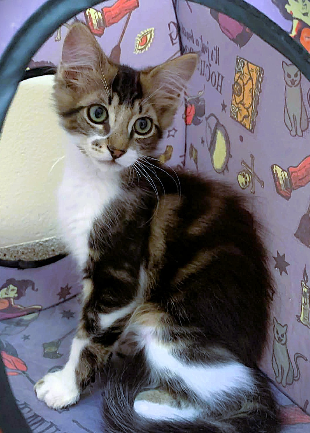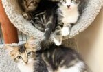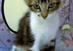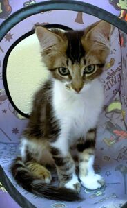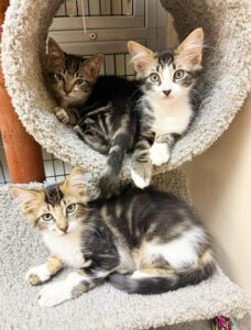 Hi, I’m Ulysses. My sister, brother, and I were born in someone’s backyard. Our Mama disappeared when we were about three weeks old, and the people who found us couldn’t keep us, so they brought us to SBAC. We went to a foster home where we grew into happy, playful, and friendly kittens. I’m the biggest kitten of my litter, but I’m a gentle boy. My foster Mom says I’m a very special kitten with a big personality and will be your friend forever. I love to wrestle with my sibs, hide in boxes, play with pingpong balls, and chase feathers on a pole. I also like sleeping with humans and having my paws massaged. I enjoy being with people and with other cats and am hoping for a forever home with my brother, Utah, or with another kitten or young cat. He’s with me in one pic, and all three of us are in two others.
