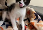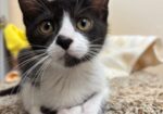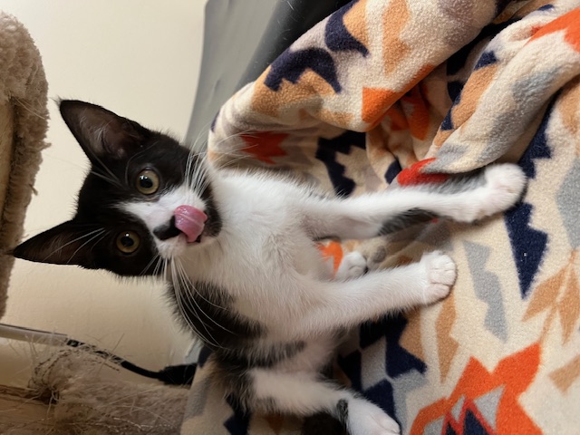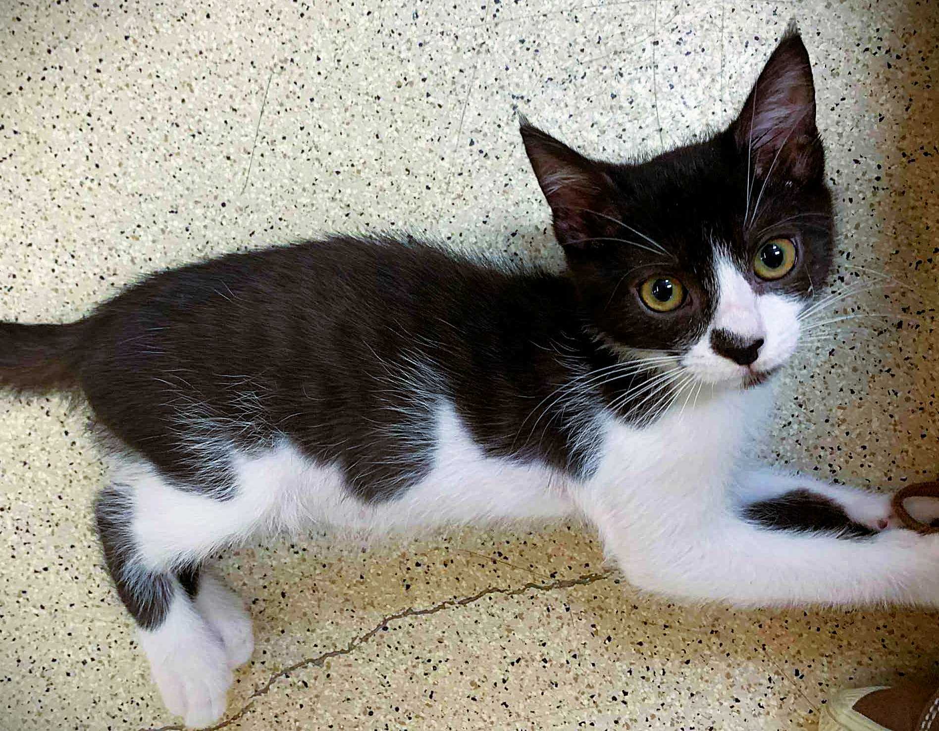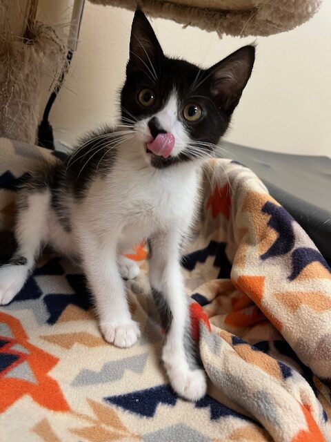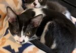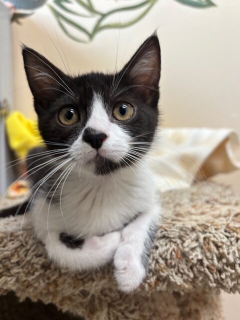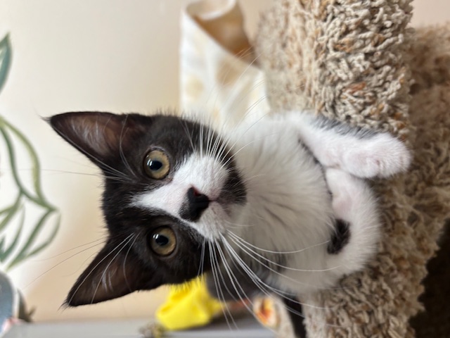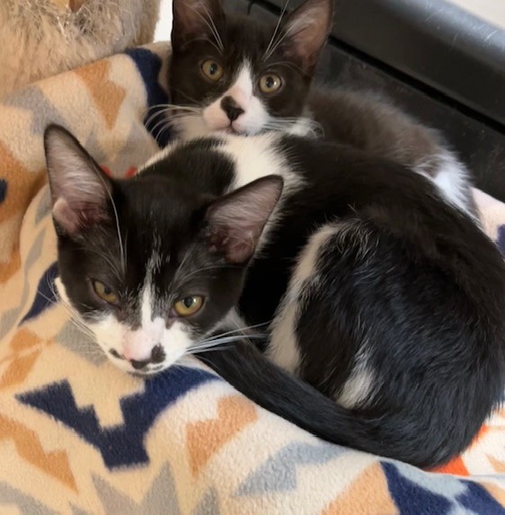 Hi, I’m Valley. I was just four weeks old and all alone when I was rescued from the street. I came to SBACC and then went to a foster home to join some other orphaned kittens. I’m a loving, affectionate, playful lap kitten who’s never been shy or scared. I was smaller than some of my foster sibs, but I could hold my own playing with them. I love attention and will beg to be picked up. I also liked to perch on my foster Mom’s shoulder. She says I’m an absolute sweetheart and a very confident kitten. I’m now ready for my forever home and hope to go with another kitten or young cat or to a home that already has one. I’m behind my foster sister, Tink, in one pic.