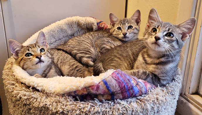 I was the boldest of my sisters at first, but they’re all about as brave as I am now! I can’t let them overshadow me so I make up for that in energy and speed! I’m also very patient and will let you pick me up and hold me. I love food and am the first to be there when I hear a can open, and will yell until you give me what I want! When I wear myself out from endless play I’ll sleep wherever I want, so watch your step! I definitely need to go home with a buddy, hopefully one of my sisters! That’s all three of us in one pic!