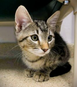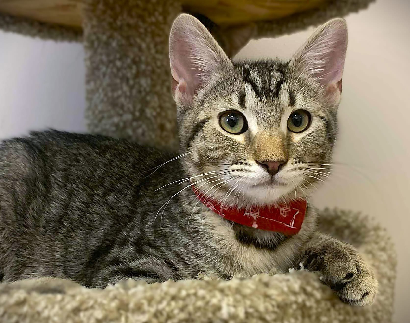 Hi, I’m Whisper. My Mamma and four brothers and I were living in a concrete basin in the backyard of a volunteer’s friend. It wasn’t very comfortable or very safe, and we were scooped up and brought to SBACC. We then went to a foster home where Mamma was able to take care of us in a safe place. My brother, Wyatt, and I are identical twins – we are double the trouble. We’re short-haired, brown tabby boys who love to explore and play with each other and our other brothers. The mouse on a wire is my favorite toy. Our foster home had grown-up cats and a very large, calm dog, who didn’t bother us, but we all loved to run by him and hiss at him. We played with the grown-up cats. When we weren’t busy playing, we enjoyed a nice warm lap. My brothers and our Mom have all been adopted, but I’m still waiting. I would love a home with another kitten, or a young cat would be fine too. I am just looking for a loving fur-ever home.
