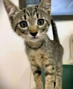 Hi, I’m Wyatt. My Mamma and four brothers and I were living in a concrete basin in the backyard of a volunteer’s friend. It wasn’t very comfortable or very safe, and we were scooped up and brought to SBACC. We then went to a foster home where Mamma was able to take care of us in a safe place. My brother, Whisper, and I are identical twins – we are double the trouble. We’re short-haired, brown tabby boys who love to explore and play with each other and our other brothers. The mouse on a wire is my favorite toy. Our foster home had grown-up cats and a very large calm dog, who didn’t bother us, but we all loved to run by him and hiss at him. We played with the grown-up cats. When we weren’t busy playing, we enjoyed a nice warm lap. I would love to be adopted with one of my brothers, but a home with another kitten or young cat would be fine too. I am just looking for a loving fur-ever home. All five of us are in one pic.