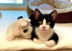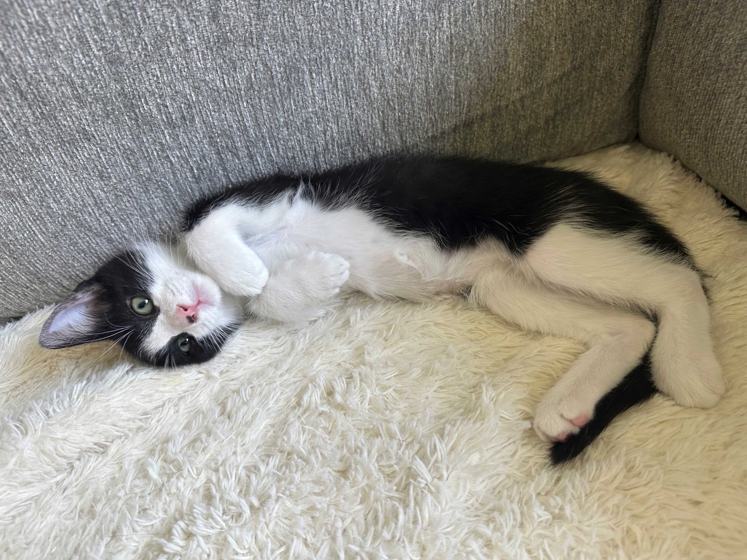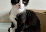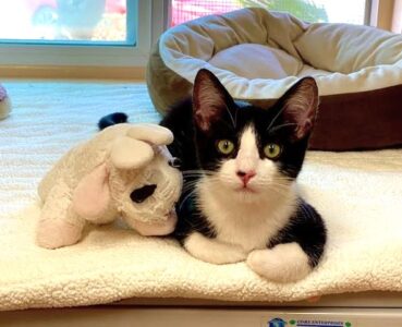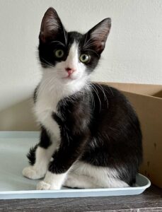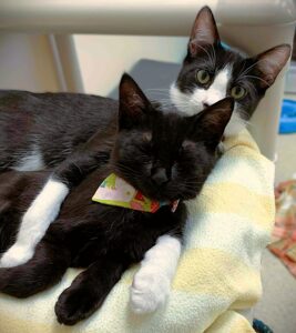 Hi, I’m Zazu. My three siblings and I were five weeks old when we were rescued from a backyard storage shed. Our Mama had disappeared. We came to SBACC and then went to a foster home that had grown-up cats, a dog, and some little kids who came to visit. We played with the cats and were OK with the dog and kids. I’m full of energy, fearless, and very playful. When I’m done racing around and chasing my siblings and toys, I enjoy cuddling with my foster parents and siblings. I also like playing on our cat tree and cat wheel. I’m a door darter, so you need to be careful that I don’t dart out the door when you’re coming or going. I would love to go to my forever home with another kitten or young cat. My sister Zima is still waiting as well – we would make a great pair! That’s us together in one pic.