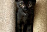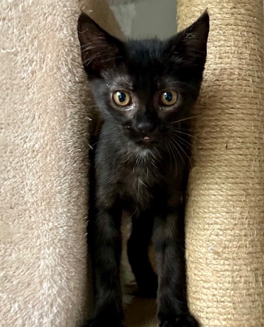 Hi, I’m Ziva. My three sibs and I were five weeks old when we were rescued from a backyard storage shed. Our Mama had disappeared. We came to SBACC and then went to a foster home that had some grown-up cats, a dog, and some little kids who visited. We played with the cats and got along well with the dog and kids. I’m a playful kitten who likes to curl up and nap on my foster parents. I like to carry my small plush toys around in my mouth, and I love playing on our cat tree and cat wheel with my siblings. I can be shy when meeting new feline and canine friends, but I was fine with the adult cats and cat-friendly dog in my foster home. My sister and I both have a small white patch on our chest, but the tip of my tail is white, so you should be able to tell us apart. I would love to go to my forever home with one of my siblings or with another kitten or young cat. I’m with all three of my siblings in one picture.