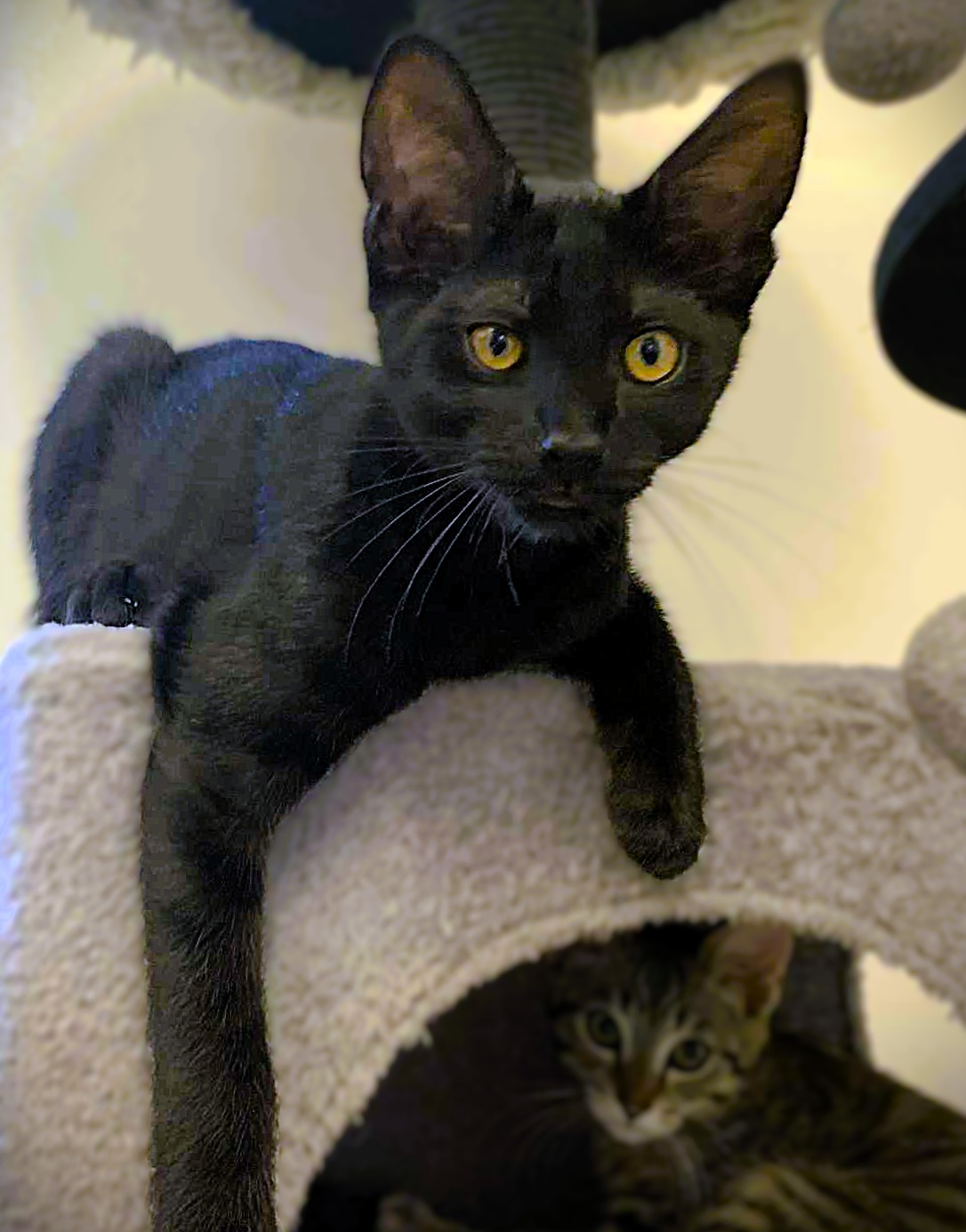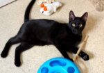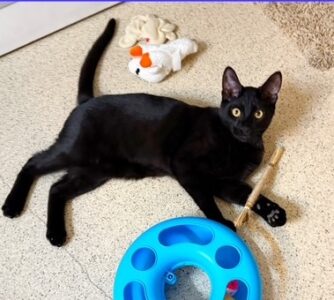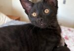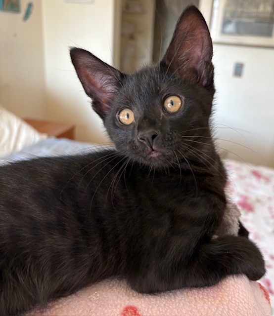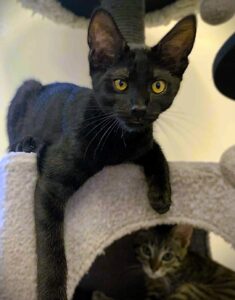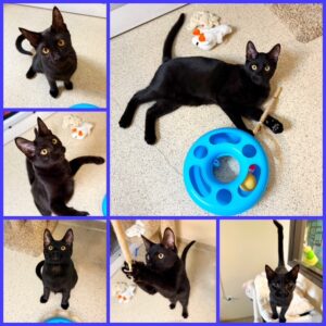 Hi, I’m Kylo. My three siblings and I were born in a woman’s yard. When we were two days old, she scooped us all up and brought us to SBACC along with our Mama, Hazel. We then went to a foster home. That same night, a friend of our foster Mom found two kittens, who were also two days old. She brought them to our foster Mom’s home, and Hazel accepted them as if they were her own. We became a family of six. Our foster mom made sure we were all warm, comfortable, and very loved. She took extra special care of our mom so she could take care of us. We were able to grow up feeling safe, nurtured, and protected. My foster Mom says that I’m confident, loving, easy-going, and a love bug. Playful is my middle name. I can spend hours pouncing, jumping, and chasing with my siblings. If it moves, I want to play with it. I love to explore new things, and I find fun in everything. When I finally slow down, I love to sleep in my foster Mom’s lap or cuddle next to my siblings. I’m happy, trusting, and a definite lap kitten. I would love to go home with another kitten (a sibling would be awesome) or a young cat, because I do love to play.