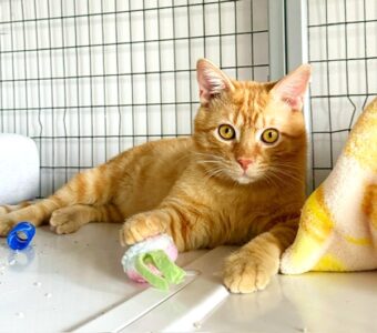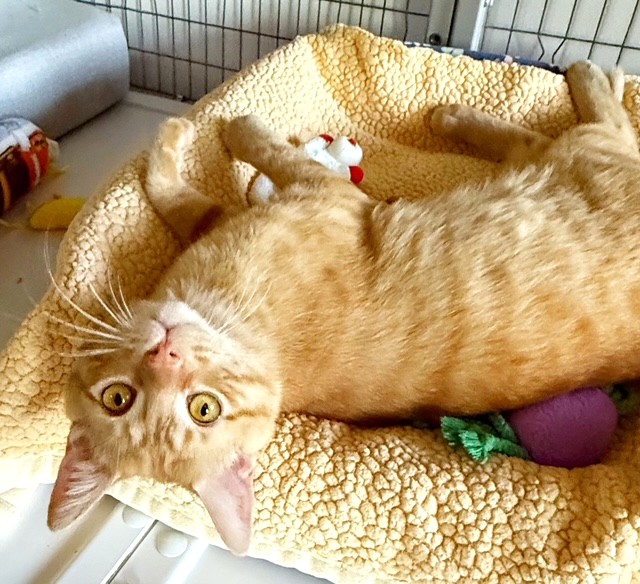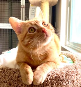 Hi, I’m Lyon. I was about four months old when I came to SBACC. I was in critical condition, dehydrated, malnourished, and not very responsive. I couldn’t sit, stand, or eat, and my pupils were dilated. I’m told that I looked like I was dying and probably would have in another few days. I was immediately sent to the vet, hospitalized, and had tons of tests that ruled out lots of different disorders. It was finally concluded that I had FIP, which, not too long ago, was a death sentence but is now treatable and curable thanks to a new antiviral medication. I was started on this medicine, and within a few days, I started to get better. It was like a miracle, but the treatment is not quick and easy; it takes 84 days of daily medication. I continued to gain weight and get better, and was soon looking and acting like a normal kitty. I have finally finished my meds and am doing really well. I have even finished the required 84 days of observation, so I am considered cured! I’m a playful, friendly, and affectionate young cat, ready to find my forever home. I hope you will come meet me, and I bet you will fall in love with me.