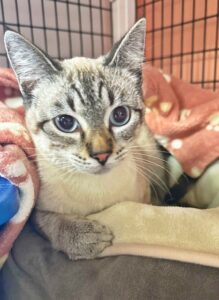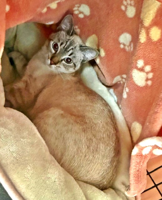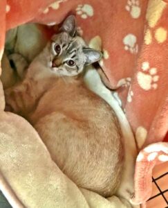 Hi, I’m Mary.  My brothers, Peter and Paul, and I were put in a box.   The box had some holes punched in it so we could breathe, and it was taped shut so we couldn’t escape.  The box was left in an alley by some dumpsters and discovered by a man who was throwing out his trash.  He heard us before he could see us, and when he opened the box, he couldn’t believe he had found three healthy, friendly cats.  He kept us for a few days but couldn’t give us permanent homes, so he brought us to SBACC.  We are all friendly, affectionate, and love attention.  We’re past the crazy kitten stage but still full of kitten energy.  We’re hoping to find our forever homes real soon.